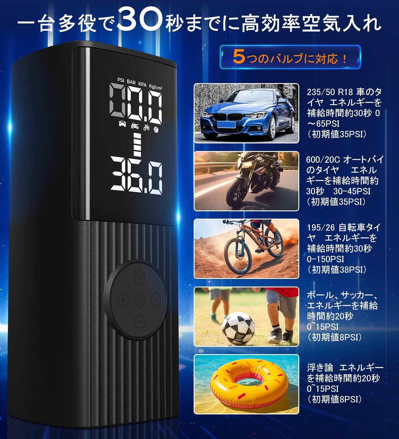 【自転車に使える電動空気入れ】:電動 空気入れは、高性能チップと強力モーターを搭載し、最大150PSIの高圧力と強力なエアフローを実現します。LCDディスプレイにはリアルタイムの圧力値とプリセット値が±1psi精度で表示され、タイヤ圧力の状態を簡単に読み取り、観察することができます。 圧力単位はスイッチボタンで "PSI"、"BAR"、"KPA"、"kg/cm²"の4種類から選択できます。圧力単位、空気圧モード、バッテリー残量、設定空気圧、リアルタイム空気圧値の情報はLCDディスプレイに表示されます。