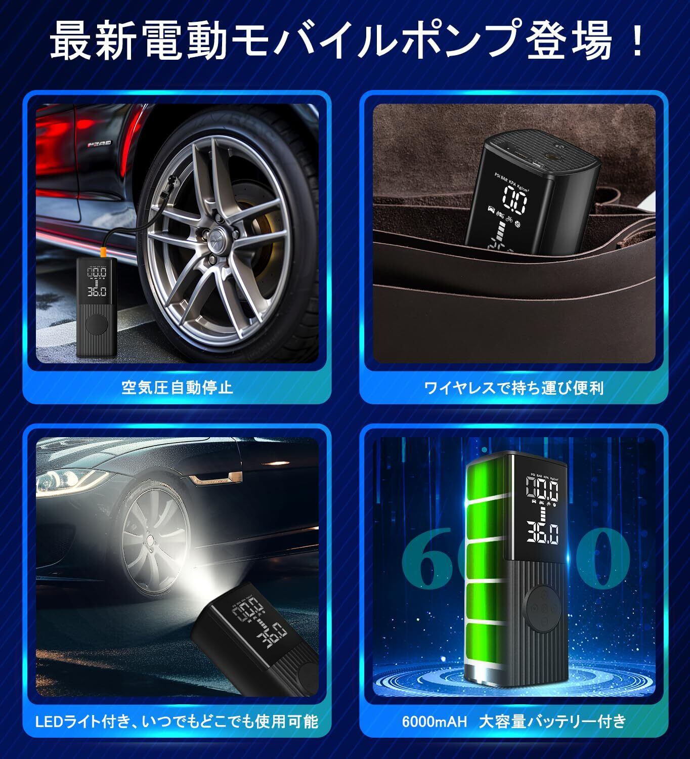 特徴 150PSI 最大圧力, 6000mAh 大容量バッテリー, LEDライト, 可能ライターコード/SOS/LED懐中ライト/収納袋付/収納袋日本語説明書 コンパクト, 空気入れ 電動