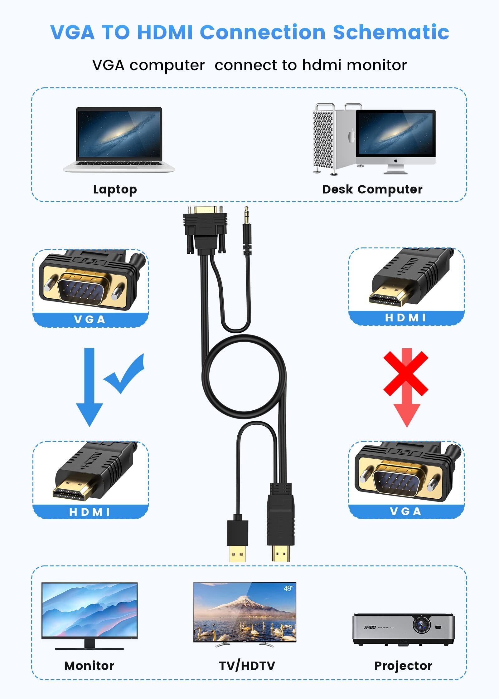 【注:双方向ではありません】VGA HDMI 変換 アダプターケーブル、VGAからHDMIディスプレイ(テレビ/モニター)にのみ移動します。音声付きVGA HDMIアダプタケーブルは、VGA(アナログ信号出力)をHDMI(デジタル信号)に変換するだけです。HDMI - VGAケーブルとしては使用できません。VGA-HDMIアダプタケーブルを使用する場合は、USB電源も同時に接続する必要があります。