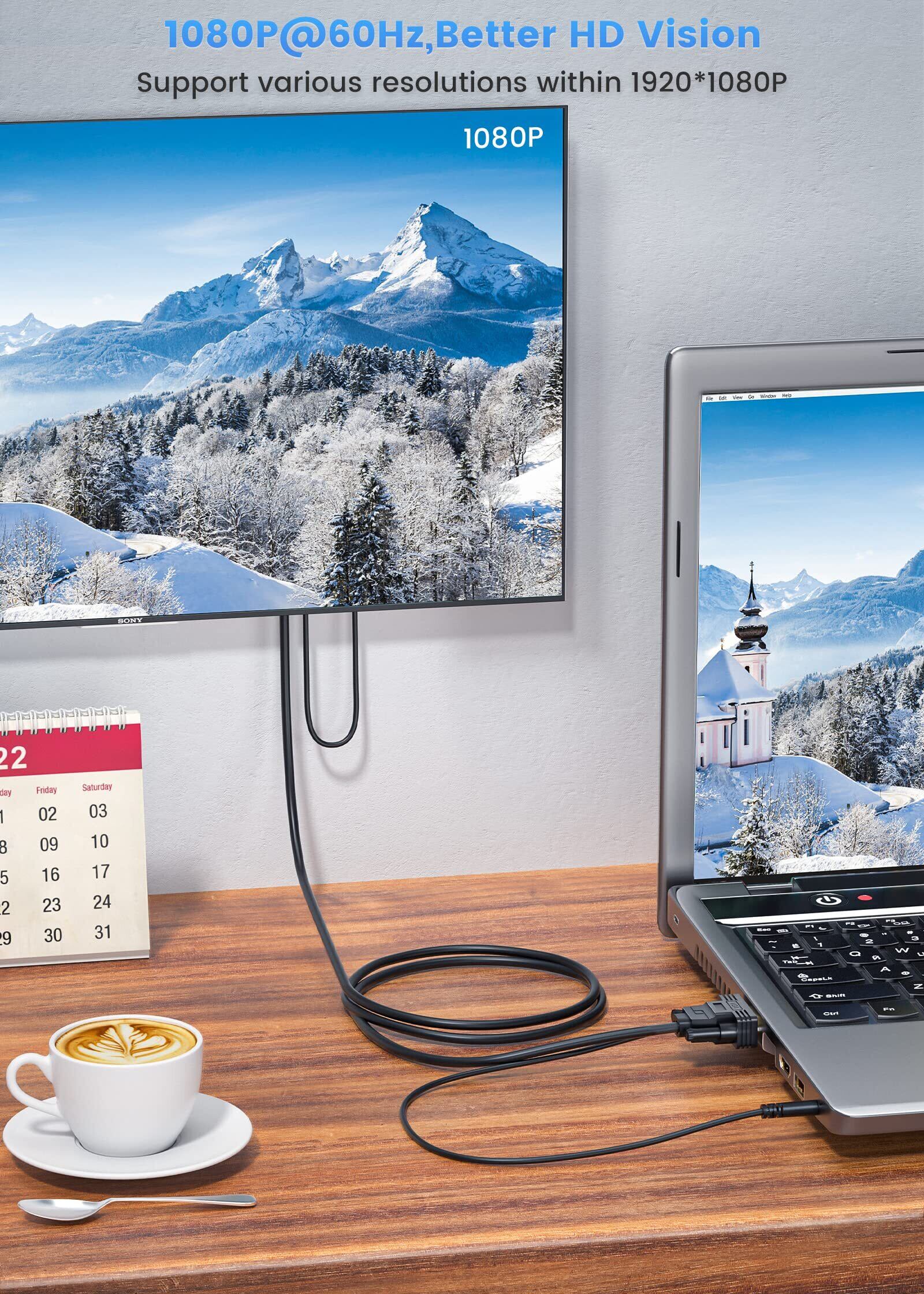 【オーディオとビデオの同期をサポート】VGA-HDMIケーブル 最大1920x1080P 60Hzのビデオ解像度をサポートし、24ビットをサポートします。3.5mm AUXまたはオスRCAステレオコネクタを介してステレオオーディオを伝送するHDMIケーブルへのVGA。HDMIからVGAに信号を送信することはできず、双方向アダプターではありません。