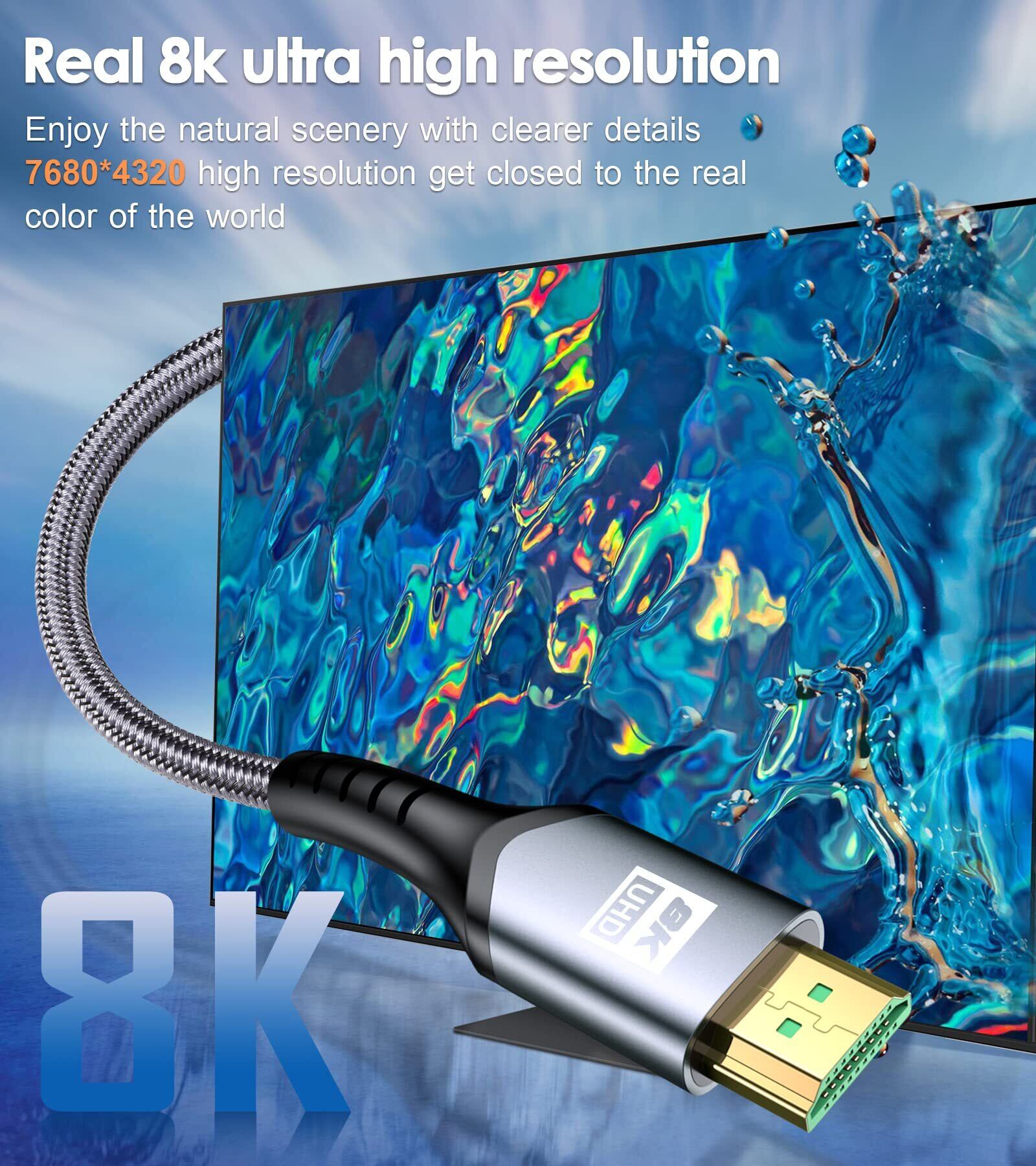 【最大8K@60Hz画質】:HDMI 2.1 ケーブルは8K@60Hz(7680*4320)の高解像度及びリフレッシュレートに対応し、4K@144Hz/120Hz及び4K@60Hzとの下位互換にもサポートし、大画面でも超高精細の画面体験と3D視覚効果をお楽しみいただけます。