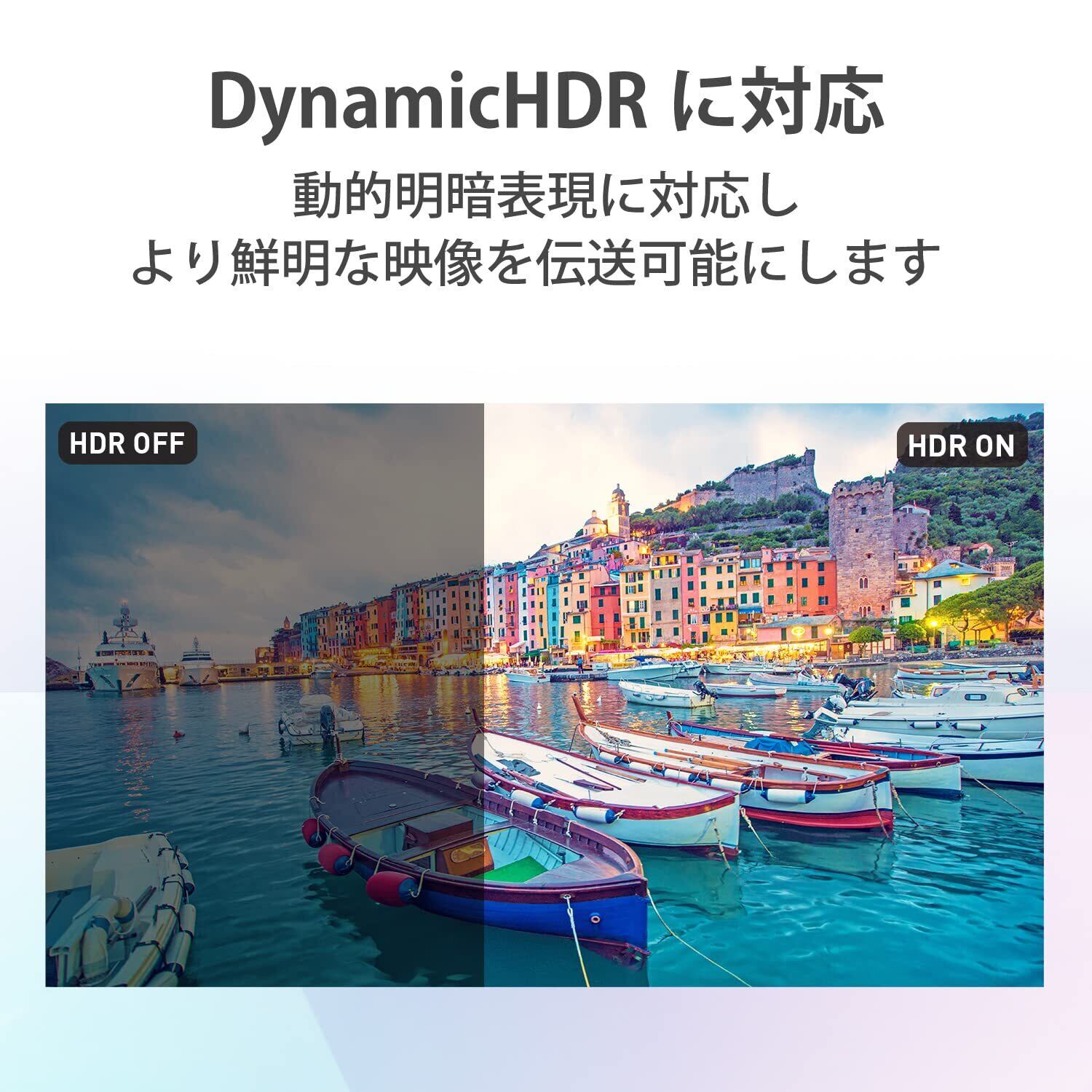 映像フレームごとに適切な明るさとコントラストを適用する動的明暗表現に対応し、より鮮明な映像を伝送可能にするDynamicHDRに対応しています。