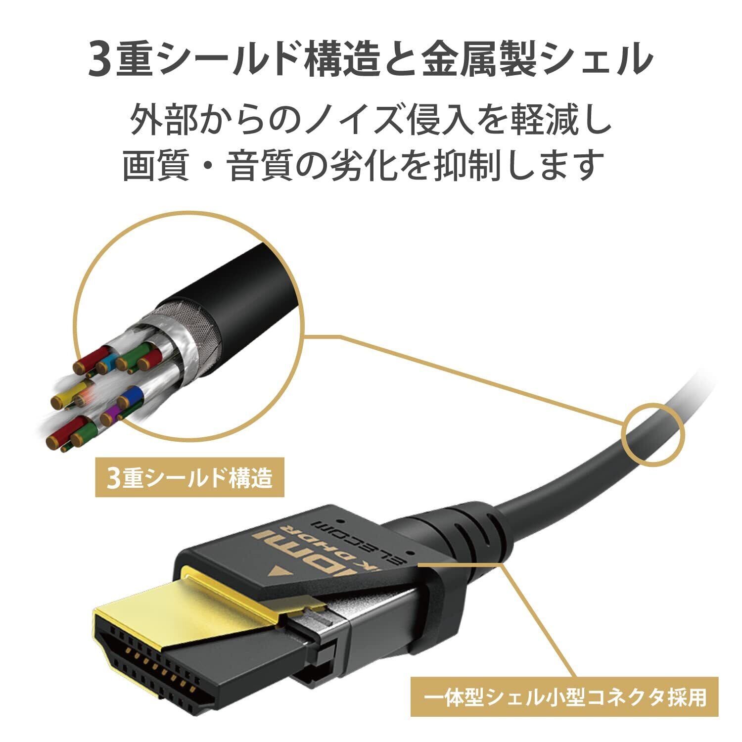 ■48Gbpsの高速伝送による8K映像の伝送に対応し、高い信頼性と機能性、ノイズ耐性を兼ね備えたイーサネット対応ウルトラハイスピードHDMIケーブルです。