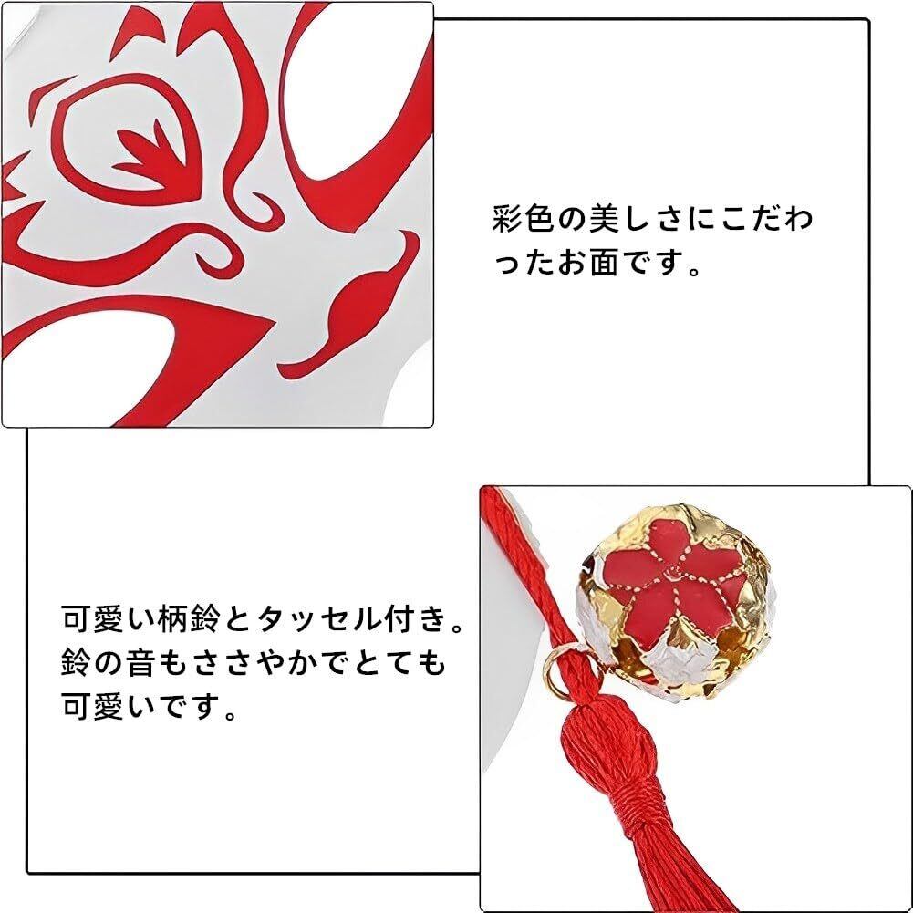 【和風なデザイン】わいらしい狐のお面です。着用の際のゴム付き、両耳の下にはリボンの先に鈴が付いたものが各2個ずつ、タッセルが付いてます。艶やかな和風な雰囲気です。