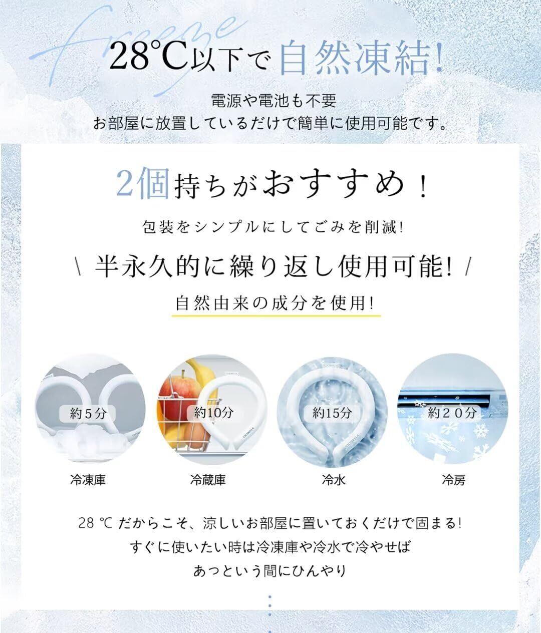 【結露が気にならない·何度でも繰り返し】2025年夏に新登場するアイスネックリング!改良されているので、より快適に使用できます。氷などと違い結露しないため水滴など気にならず、快適にお使いいただけます。28°℃以下で自然凍結! 電源や電池も不要お部屋に放置しているだけで簡単に使用可能です。28 ℃だからこそ、涼しいお部屋に置いておくだけで固まる!すぐに使いたい時は冷凍庫や冷水で冷やせばあっという間にひんやり。