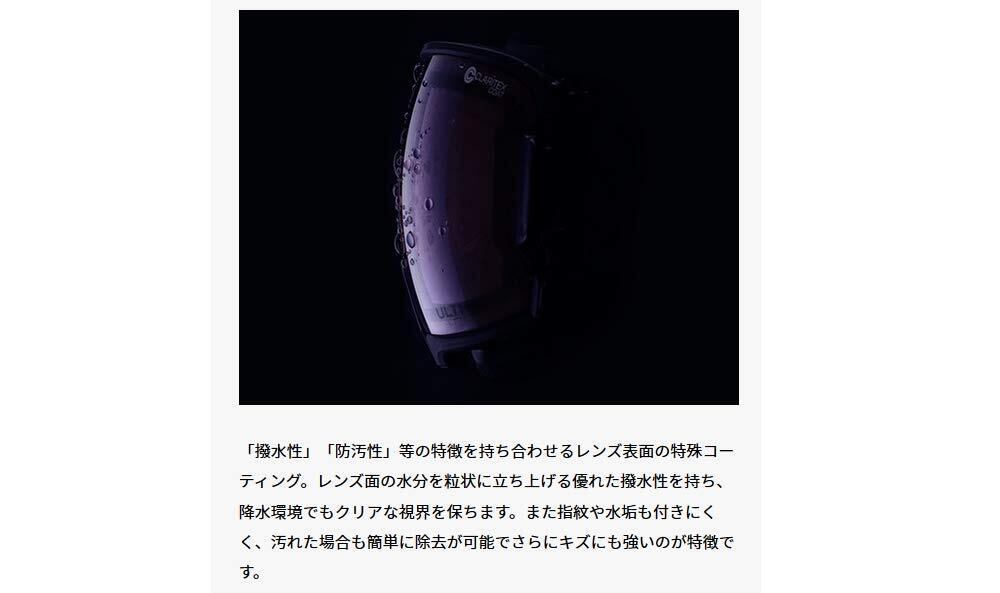 成型球面ダブルレンズ、プレミアムアンチフォグ(くもり止め加工)、クラリテックスコート(撥水)