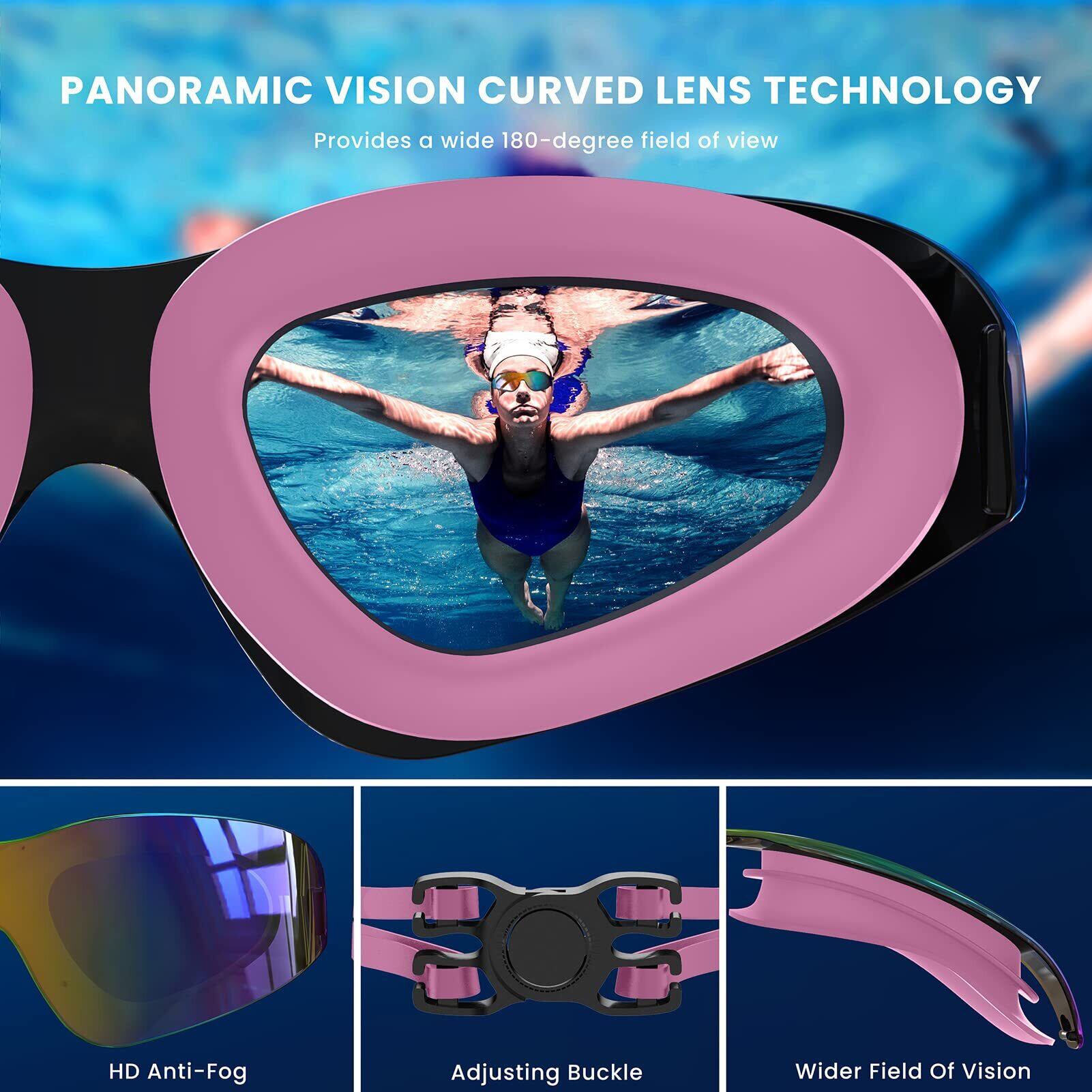 【完全に漏れない・より快適な】当社の曇り止めスイムゴーグルは、目の内側と高いノーズブリッジにより快適にフィットする防水シリコンゴーグルパッドを備えており、クッション性のある粘着シールにより完全に漏れないように設計されています。超薄型のデザインは、より広い周辺視野を確保します。