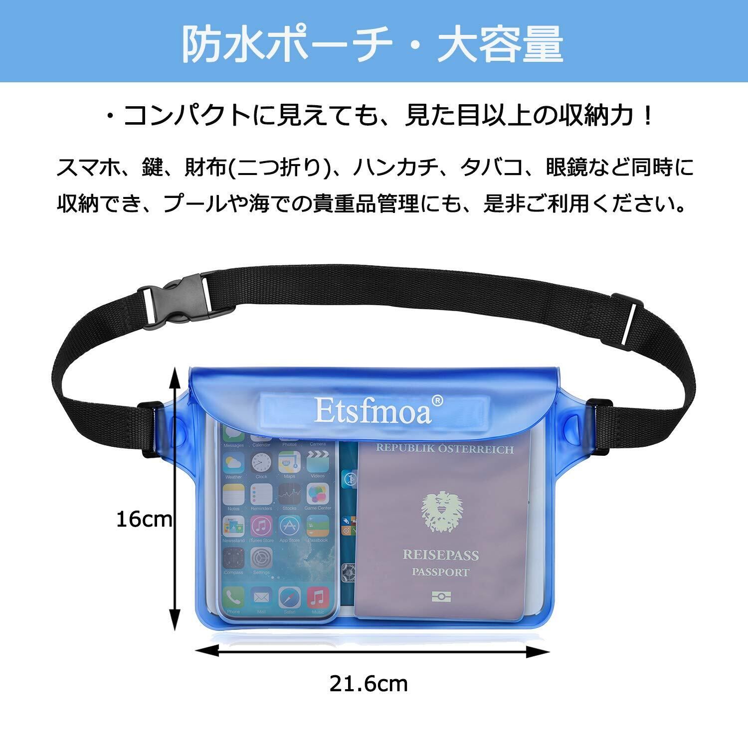 Etsfmoa 防水ポーチ 防水ケース 防水ウエストポーチ 完全防水 スマホ 小物入れ 海 海水浴 プール お釣り アウトドア 大容量 三重チャック 4WAY PVC素材 メンズ レディース 2個セット