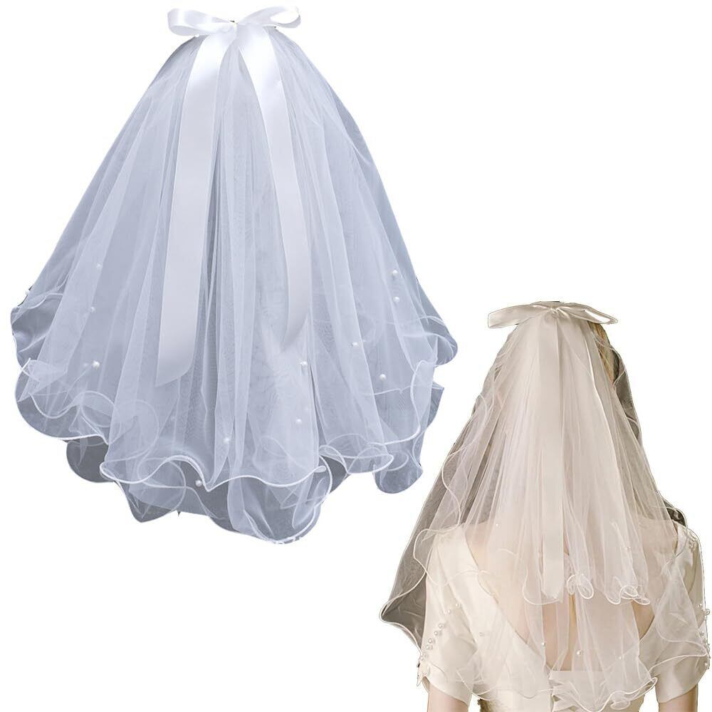 この短いベールには、絶妙な白い人工真珠が点在し。柔らかな白、控えめでエレガントな純粋なデザイン、シックな結婚式のベールはあなたの結婚式のための優れた装飾です。