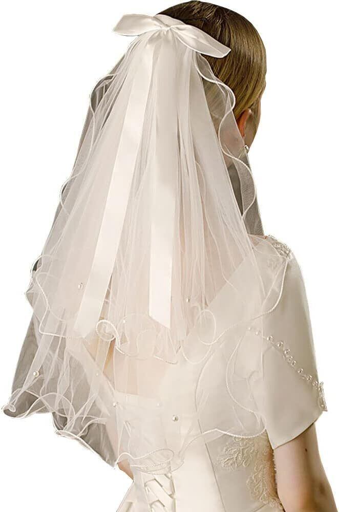 [LJJDBZYD] ベール 花嫁 ヴェール ウエディングベール レディース (ホワイト ダブルレイヤー 80cm) 2層 結婚式 り用品 かわいい 髪飾り 櫛付き 波打つ縁 花嫁用 コーム 可愛い ショートベール 蝶結び付き 写真撮影 成人式 舞台劇 花嫁飾り用品