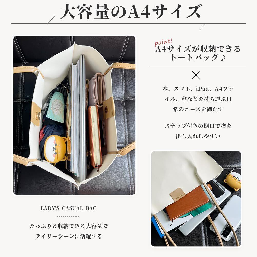 【大容量のA4サイズ】A4サイズが収納できるトートバッグです。スナップ付きの開口で物を出し入れしやすく、容量も大きく、本、スマホ、iPad、A4ファイル、傘などを持ち運ぶ日常のニーズを満たします。