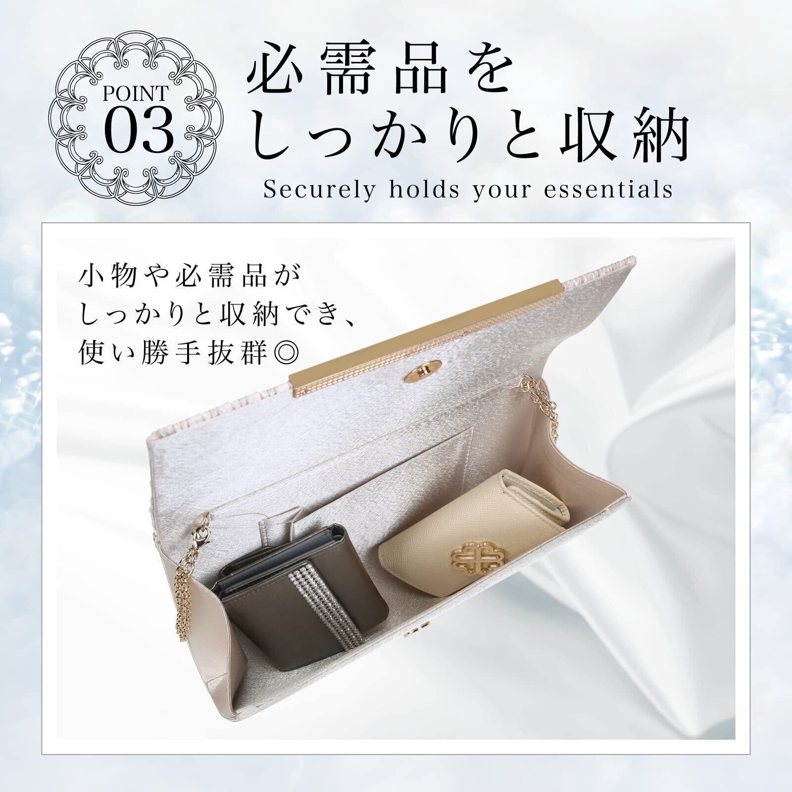 【収納・便利パーティーバッグ】:パーティーバッグ がま口小銭入れ、スマホやハンカチ、化粧品、小物など問題なく収納できます、大きすぎるアイテムは保管に適していません。