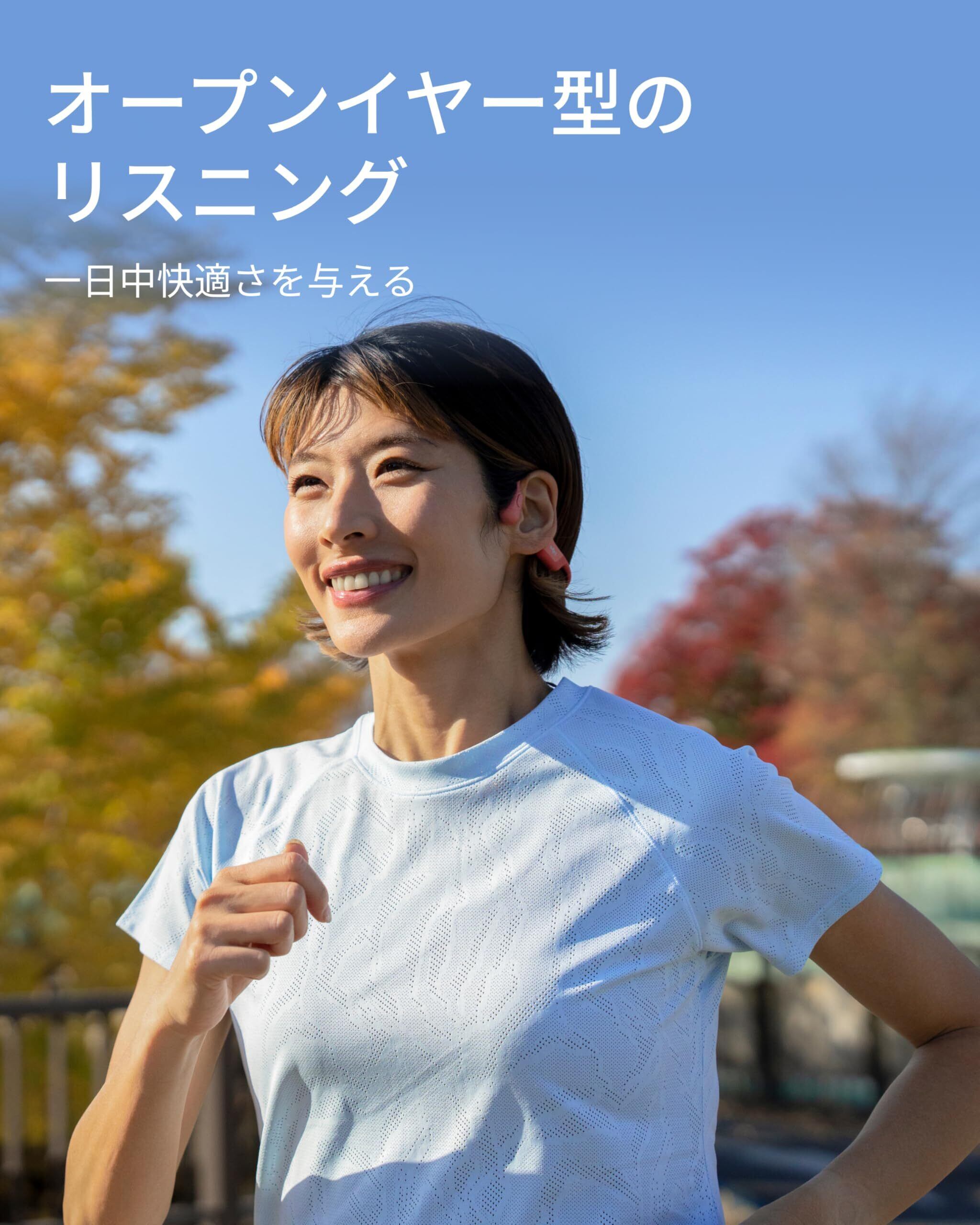 第9世代の骨伝導テクノロジー:耳を塞がず、長時間のワークアウトでも快適。使用中も周囲の車両や歩行者に気を配りながら、サイクリングやランニングを安全かつ安心して楽しめます。自由な動きと共に、しっかりとしたフィット感とオープンイヤーデザインが新しいトレーニング体験を提供します。