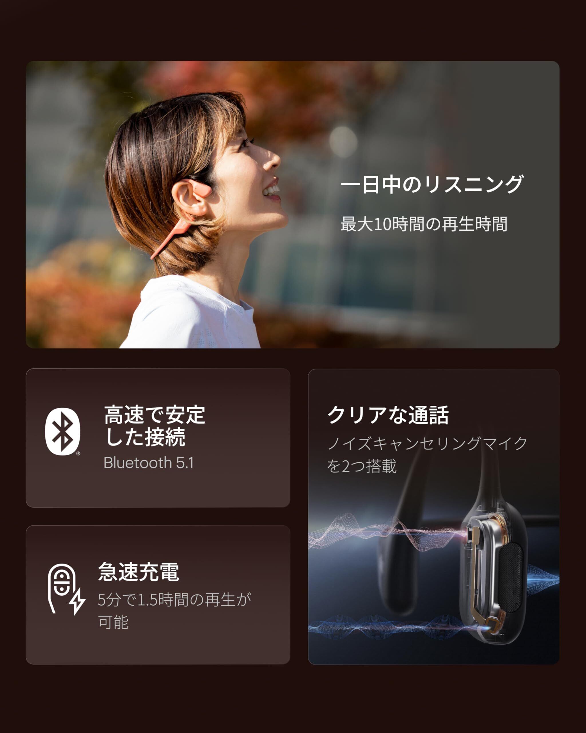 臨場感溢れる音乐:OpenRun Proは、2つの低音増強ユニットがトランスデューサに内蔵され、これによりクリアで中高音域の再生だけでなく、深みのある低音も実現されました。サウンド、ビート、コーラスなど、あらゆる音楽体験が進化しました。同時に、音漏れを最小限に抑え、プライバシーを確保します。