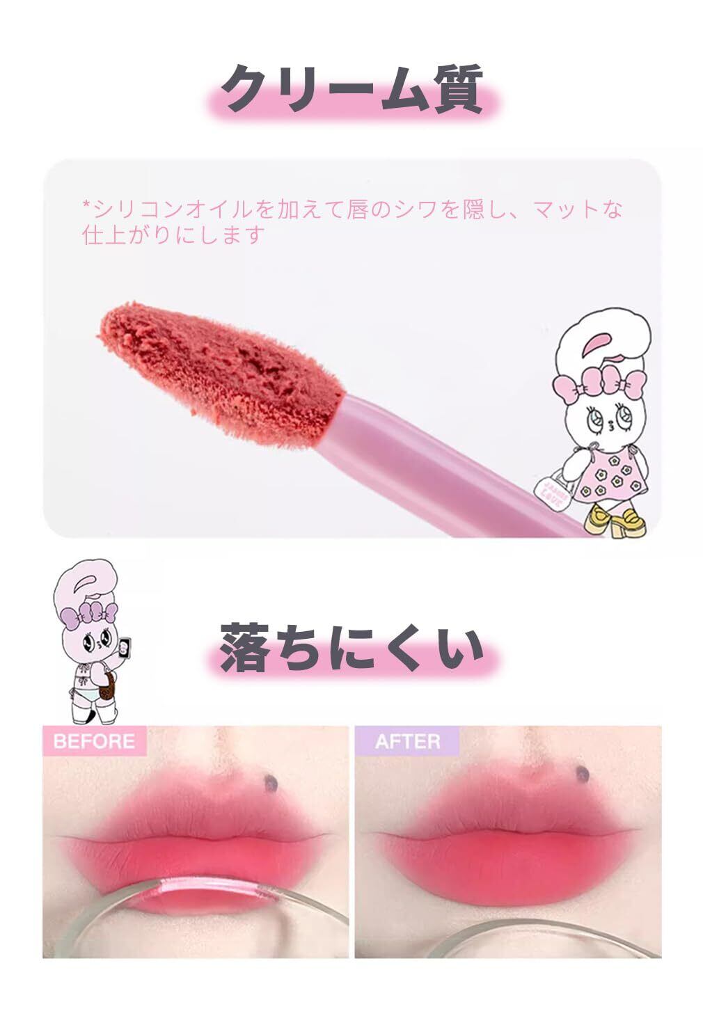 4.【高発色】:こちらのマットリップが高発色でにじまず鮮やかな発色を長時間キープ。マットリップの特有な透け感、ピュア感も備えます。