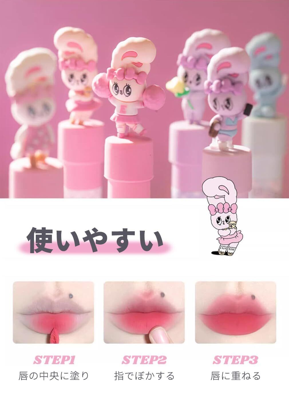 2.【高保湿】:高保湿成分配合で、唇に塗った後、すぐに乾きません。唇にみずみずしい潤いをたっぷりと与え、 縦ジワをカバーししっとりなめらかで塗りやすい、ひと塗りでくっきりと見える唇に,少女感があふれる。