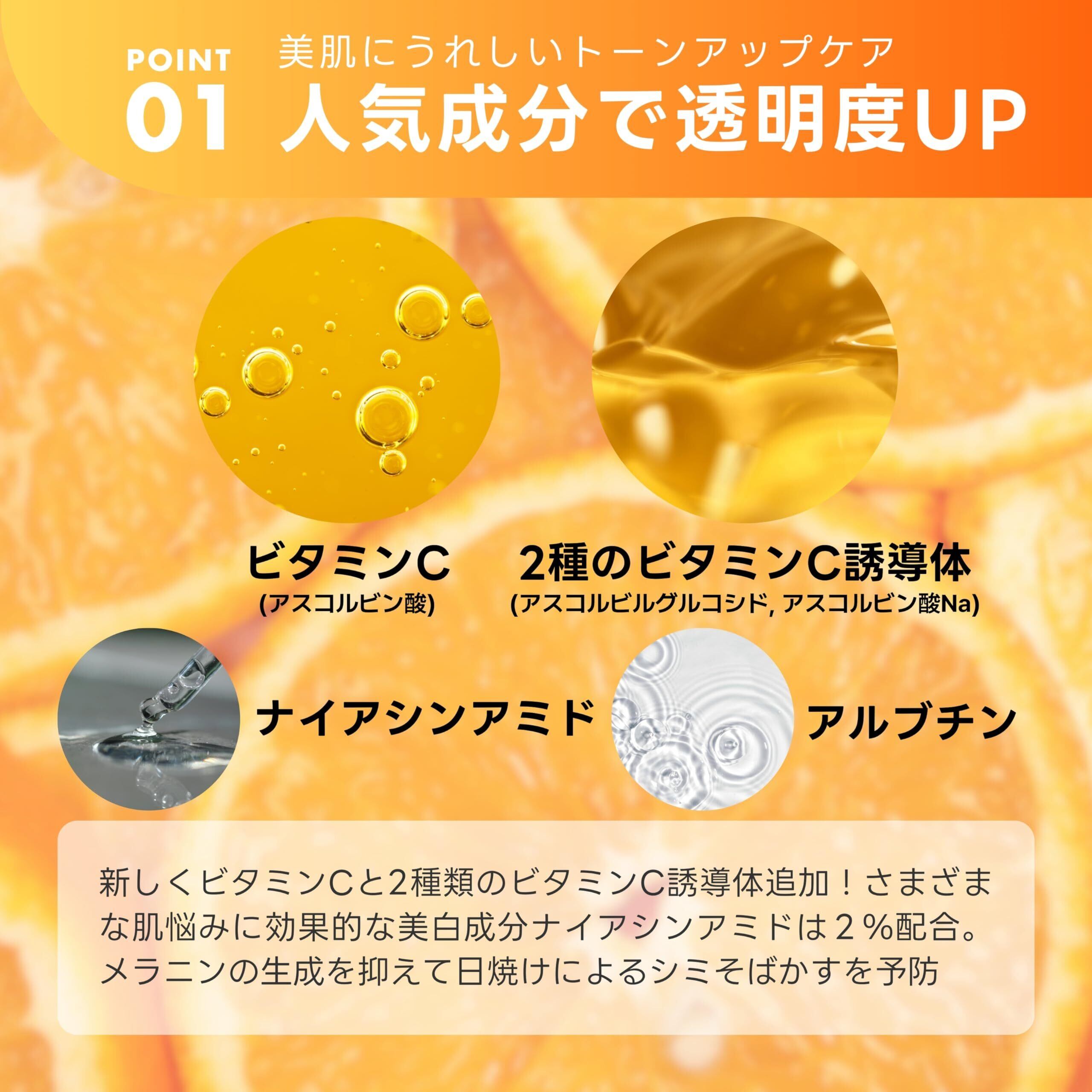 商品特長 オレンジエキスをたっぷり配合。ほかにもナイアシンアミドやアルブチンなどを配合しているので、年齢による肌悩みをサポート。