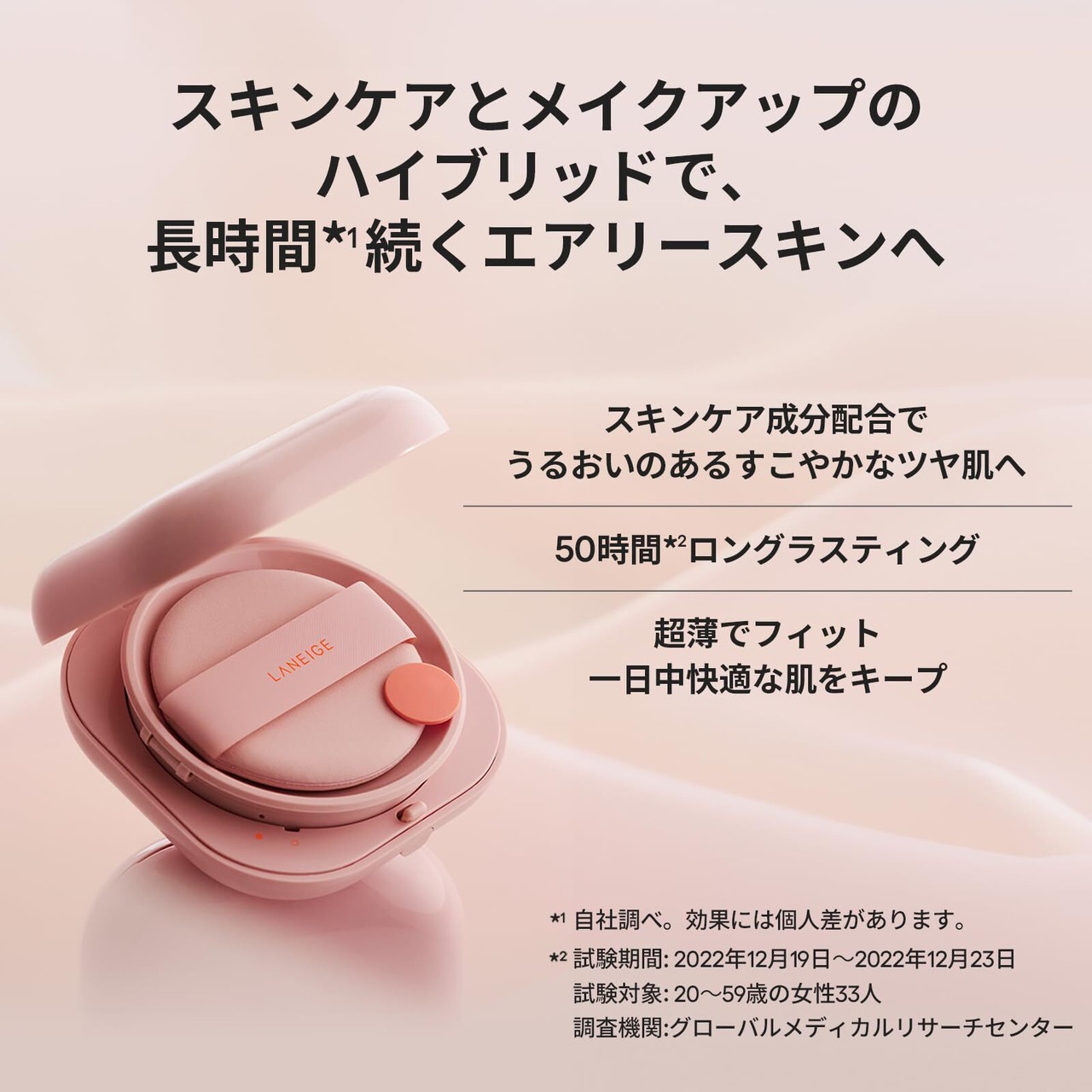 【すぐれたスキンケア成分を豊富に配合し、24時間*¹うるおいが続く肌へ】メイクアップ効果だけでなく、肌の美しさをさらに引き出すNEO BOOSTER技術を新たに搭載。保湿力にすぐれた「パンテノール」、ラネージュ独自開発の「ブルーヒアルロン酸*²」、また乾燥によるくすみをケアするサポート成分「ハス花エキス」を配合。70%以上*³含有されたスキンケア成分が24時間*²肌のうるおいをキープし、ハリのある肌へ導きます。*¹アモーレパシフィック調査、*²加水分解ヒアルロン酸、*³水を含む