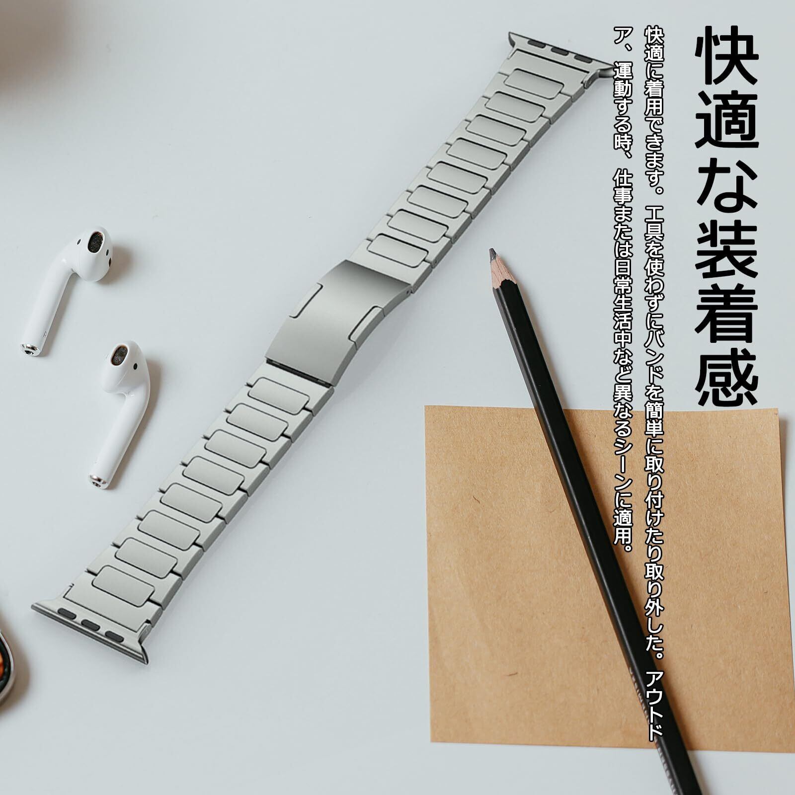 【チタニウム金属(チタン)採用|アレルギー反応少ない】チタンの三大特徴と言えば『軽い』『強い』『錆びない』。非常に軽いので、アクセサリーやバンドなど人が身に着けるものの材料として使用しても負担が少ない素材です。チタンの重さは鉄やステンレスの約60%、銅の約50%です。このApple Watch バンドはチタンを使用し、金属アレルギーのリスクが少ないので肌に優しいアクセサリーです。また汗や水に強いので、24時間365日付けられます。