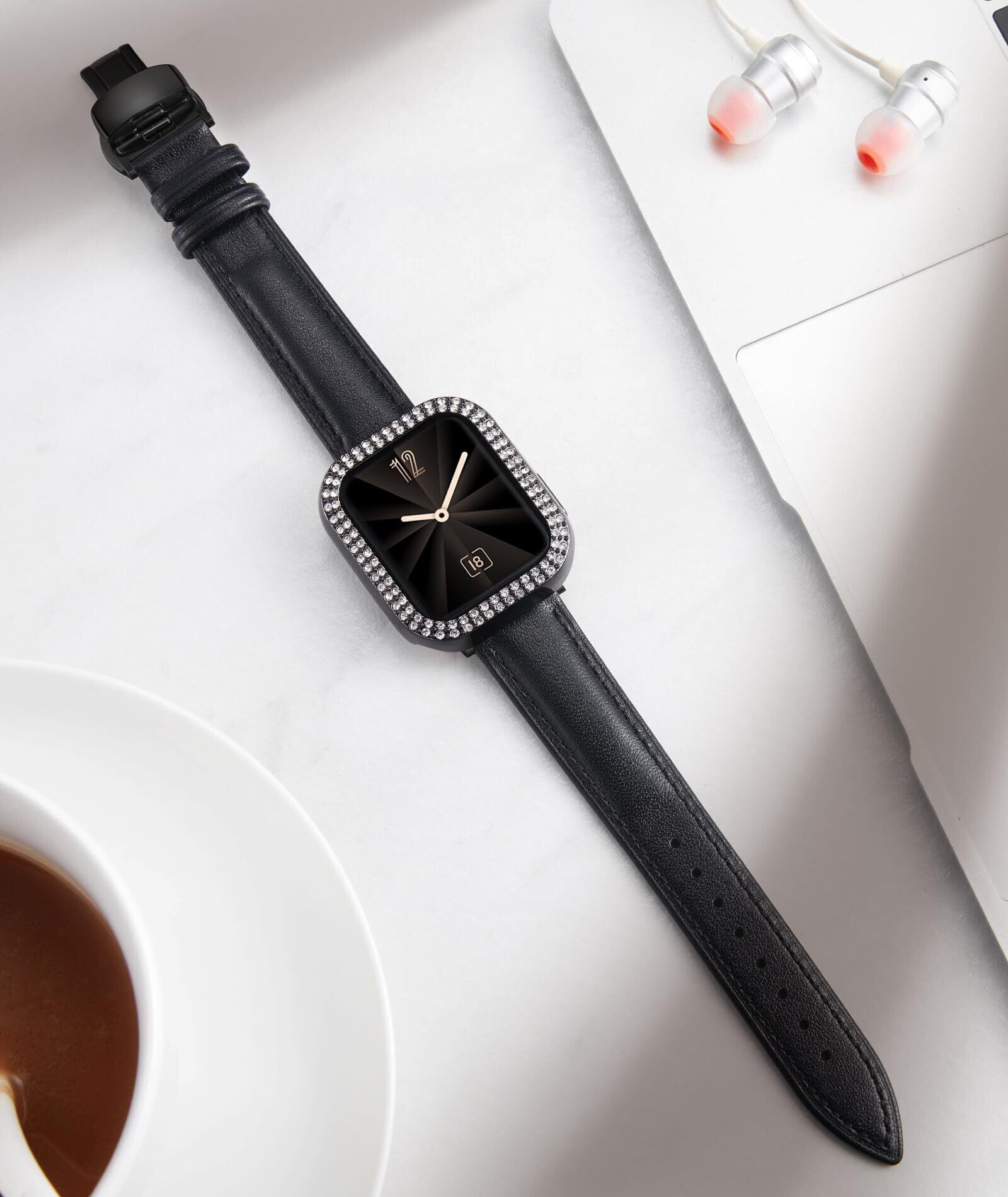 コンパチブルApple Watch バンド コンパチブルアップルウォッチバンド レザー 革ベルトキラキラダイヤモンド保護ケースー付きレディース コンパチブル iWatch Series 9/8/7/SE2/SE/6/5/4(41mm,ブラック/ブラック