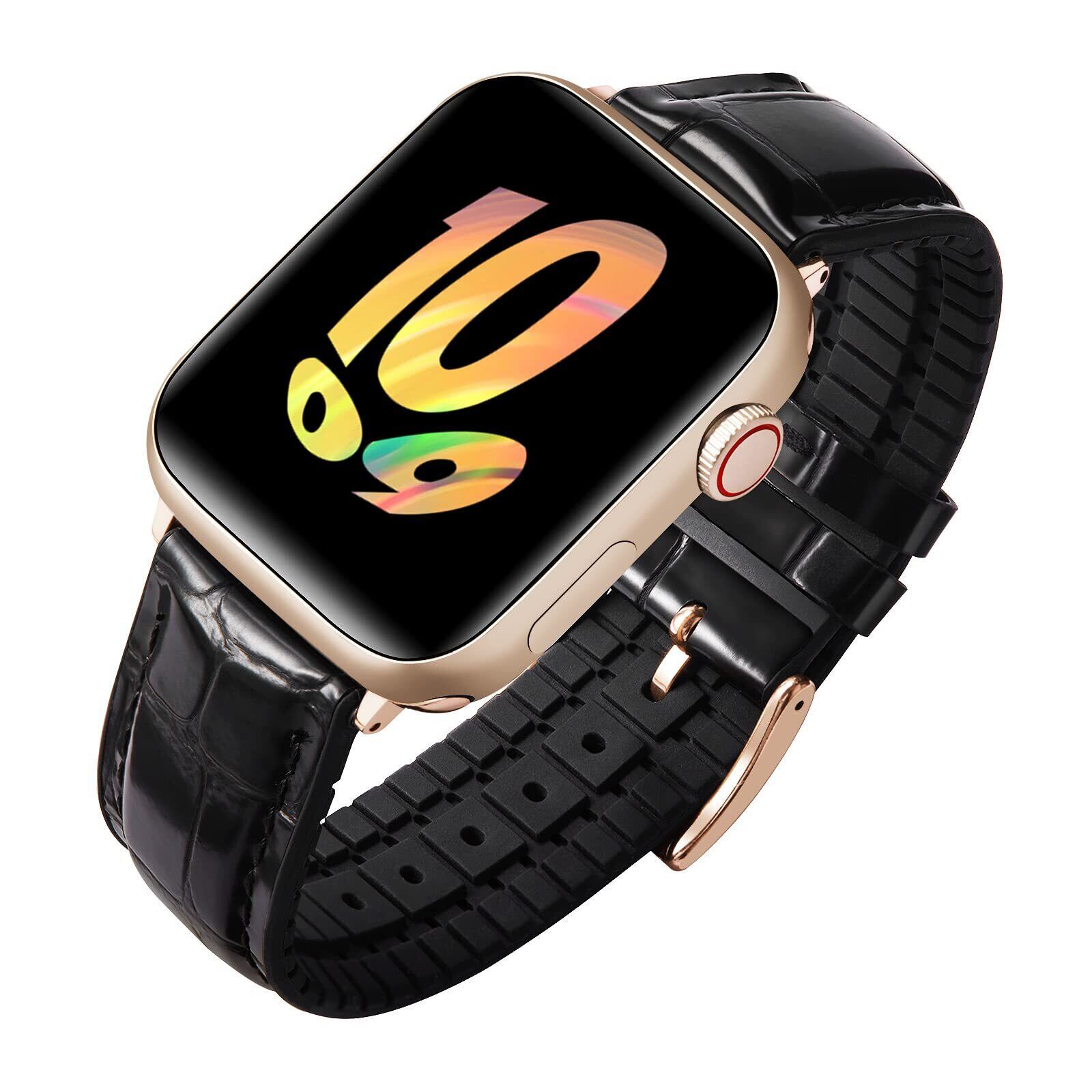 【特価セール】コンパチブル Apple Watch バンド 49mm 45mm 44mm 42mm コンパチブルアップルウォッチバンド ワニ革模様レザー 革ベルト 内側シリコン製 通気性 コンパチブル iWatch バンド Ultra2 Ultra SE SE2 Series 9/8/7/6/5/4/3/2/1 男女兼用(ブラック/ローズゴールド バックル)