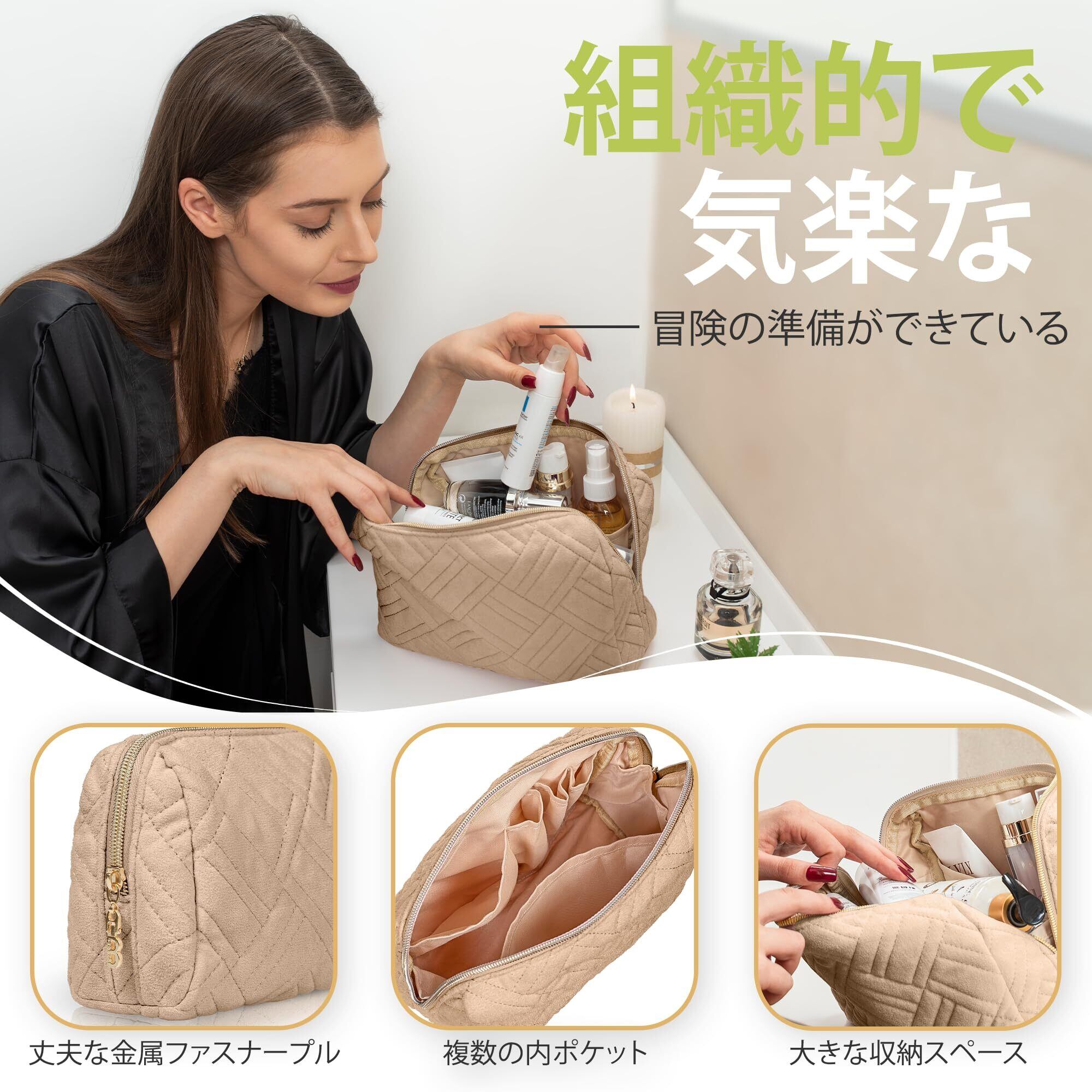 大型化粧バッグ(22.5x11x17.5cm):旅行用の化粧バッグをお探しでしたら、このジッパー付きポーチが最適です。二重縫製、撥水加工素材、そして高品質の生地が、より高い保護を実現しています。