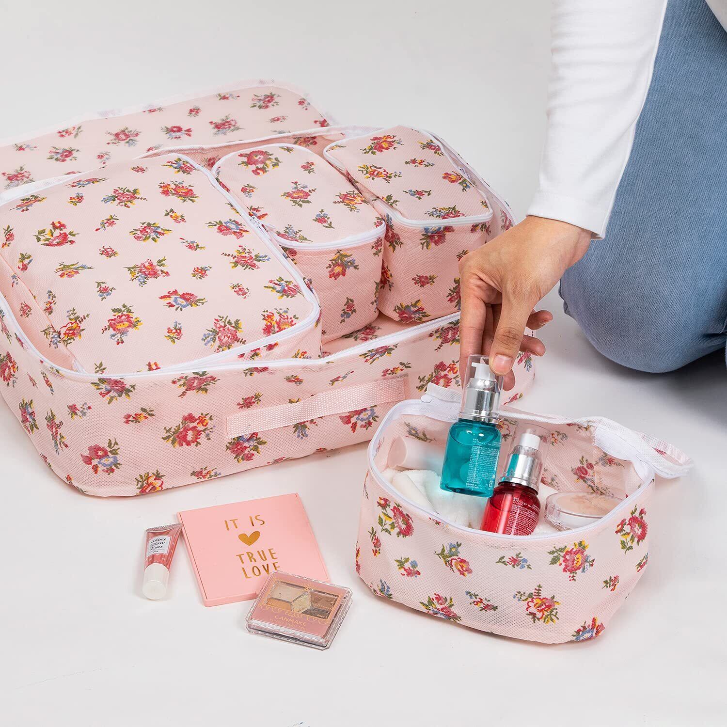 アストロ バッグインバッグ 薄ピンク 花柄 5個セット 収納ケース トラベルポーチ 小物入れ パッキング 822-66