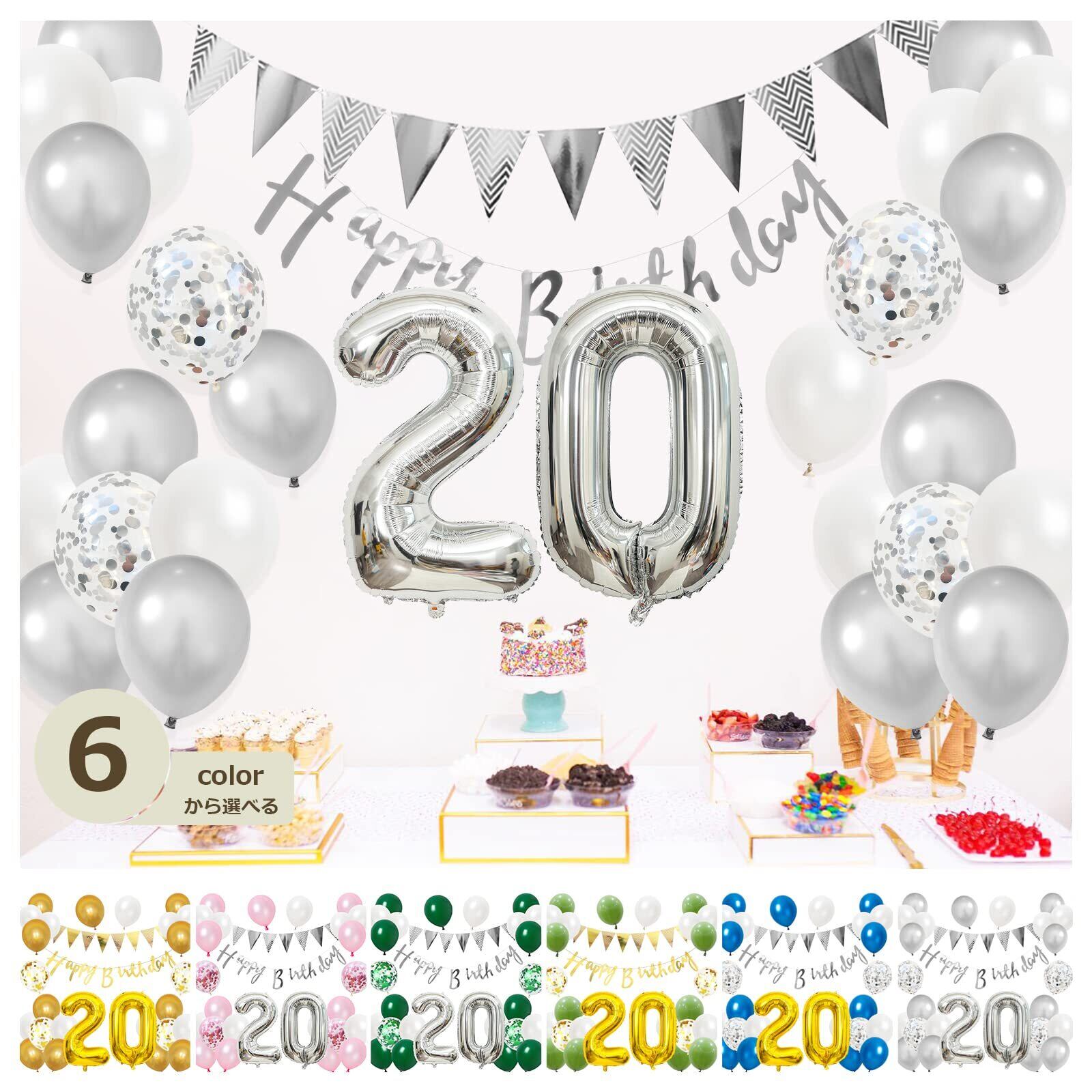 〔豪華なセット内容〕「20」数字バルーン×各1個、フラッグガーランド×1本、HAPPY BIRTHDAYガーランド×1本、紙吹雪入りバルーン×5個、ホワイトバルーン×10個、シルバーバルーン×10個、おまけ:リボン×1個、ドットシール×1枚。※商品の取り扱いは6才以上のお子様にお勧めします。ガーランドはお客様自身で糸通しをお願い致します。バルーン類は全て空気の入ってない状態でのお届けです。お届け後ご自身で膨らませてご使用下さい。