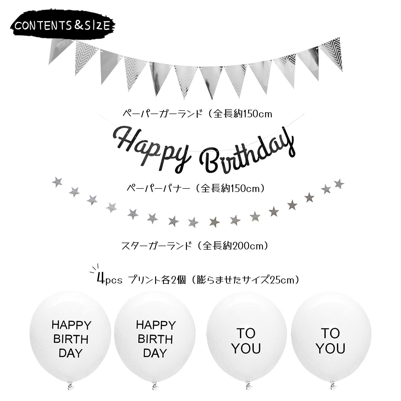 【セット内容(取り扱い:対象年齢6+以上)】①ペーパーガーランド1組 ②Happy Birthdayペーパーバナー1組 ③スターガーランド1組 ④ゴム風船(HAPPY BIRTHDAY」×2、「TO YOU」×2、紙ふぶき入り×4、メタリック×4、シルバー×4、ブラック×4) ④小道具キット(マスキングテープ、リボン)