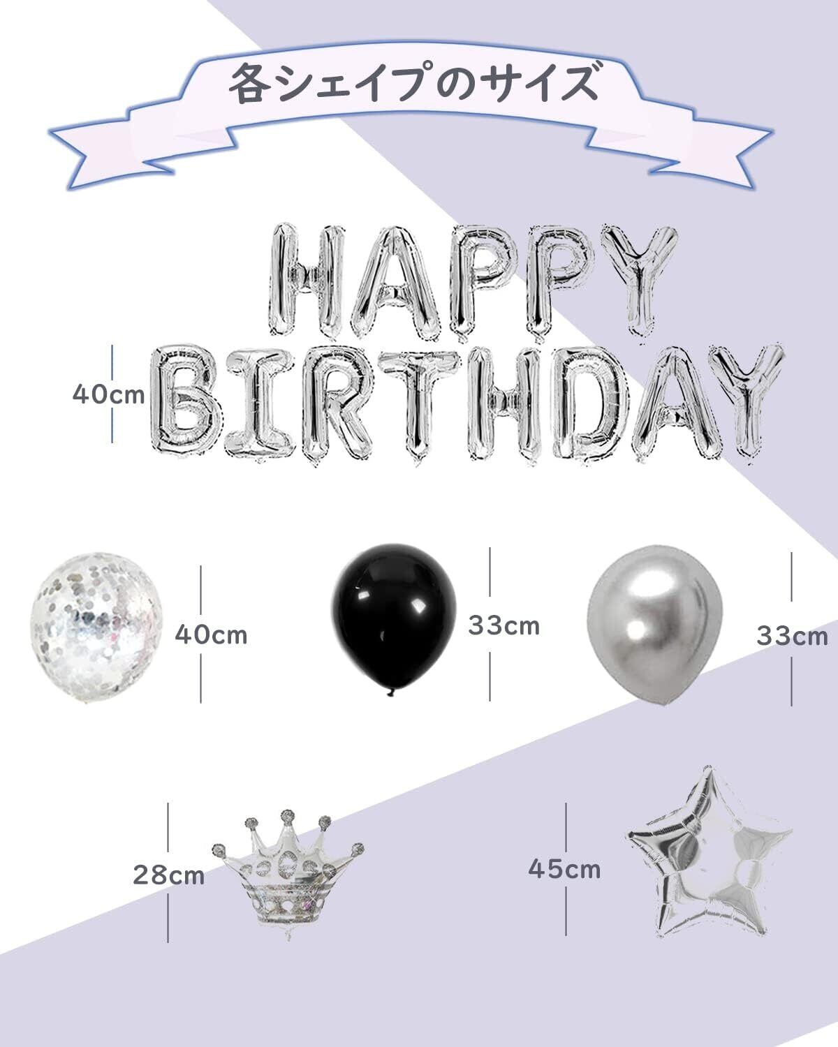 輝くセット:誕生日バルーンセット内容:シルバー紙吹雪バルーン×4個、シルバーバルーン×2個、ブラックバルーン×4個、Happy Birthday風船各文字×1個、スターバルーン×2個、王冠バルーン×1個、ドットシール×2個、シルバーリボン×10 m、吸込管×1本
