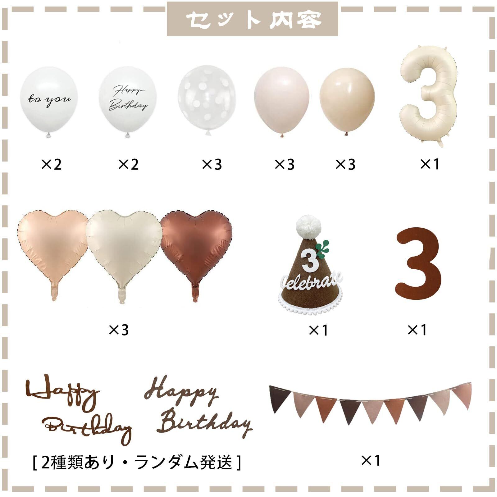 【セット内容】①ゴム風船×13(Happy Birthday × 2、TO YOU × 2、グレージュ× 3、肌色× 3、クリアドット× 3) ②ハートバルーン×3(クリーム色×1、肌色×1、チョコレート色×1) ③数字バルーン×1 ④三角帽子×1 ⑤フェルトの三角旗ガーランド×1 ⑥フェルト数字 ⑦フェルトアルファベット(2種類あり・ランダム発送) ⑧両面テープ