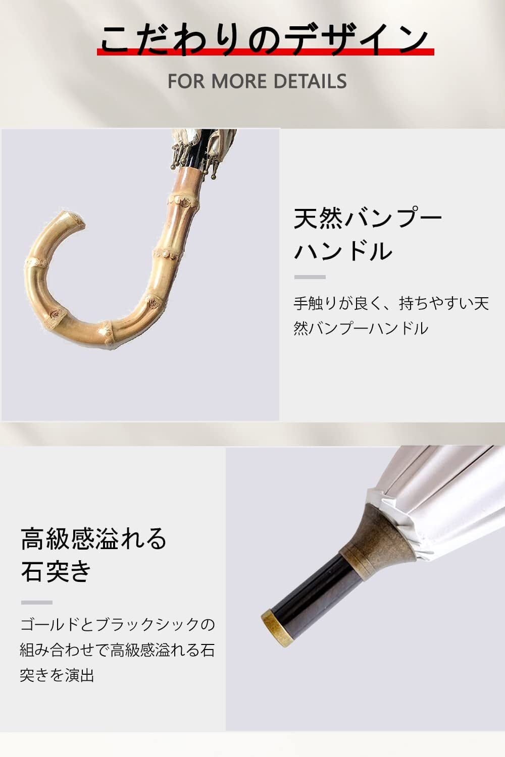 ✦【可愛くオシャレ・上品なデザイン・軽量日傘】長傘は気分が上がる配色・ホワイト、フラワー、刺繡など落ち着きのある色味で飽きのこないベーシックなデザイン、どんなシチュエーションやスタイルにも合わせやすい。まるくかわいいシルエットが魅力で、女性らしいエレガントな雰囲気を醸し出します。スリム型のショット傘なので、収納しやすく携帯便利です。誕生日、母の日、アウトドア、通勤、通学、贈り物、撮影会、結婚式、旅行、結婚記念日、就職祝い、暑中見舞い、還暦祝い、寿祝いなどのプレゼントとして最適。【商品詳細】サイズ:親骨:(約)50cm 使用時 : (約)直径90cm 材質: ポリエステル / バンブー(竹) / アルミ/重量: (約)/250g 遮光率:100% UV遮蔽率:100% UPF評価:UPF50+。