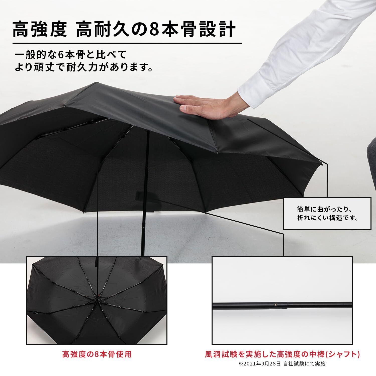 【風洞試験済みの風に強い傘】風洞試験を行い、風に対して対策を重ねた折り畳み傘です。風に対して研究しつくした傘の形状となっております。※強風時の使用は推奨しておりません。