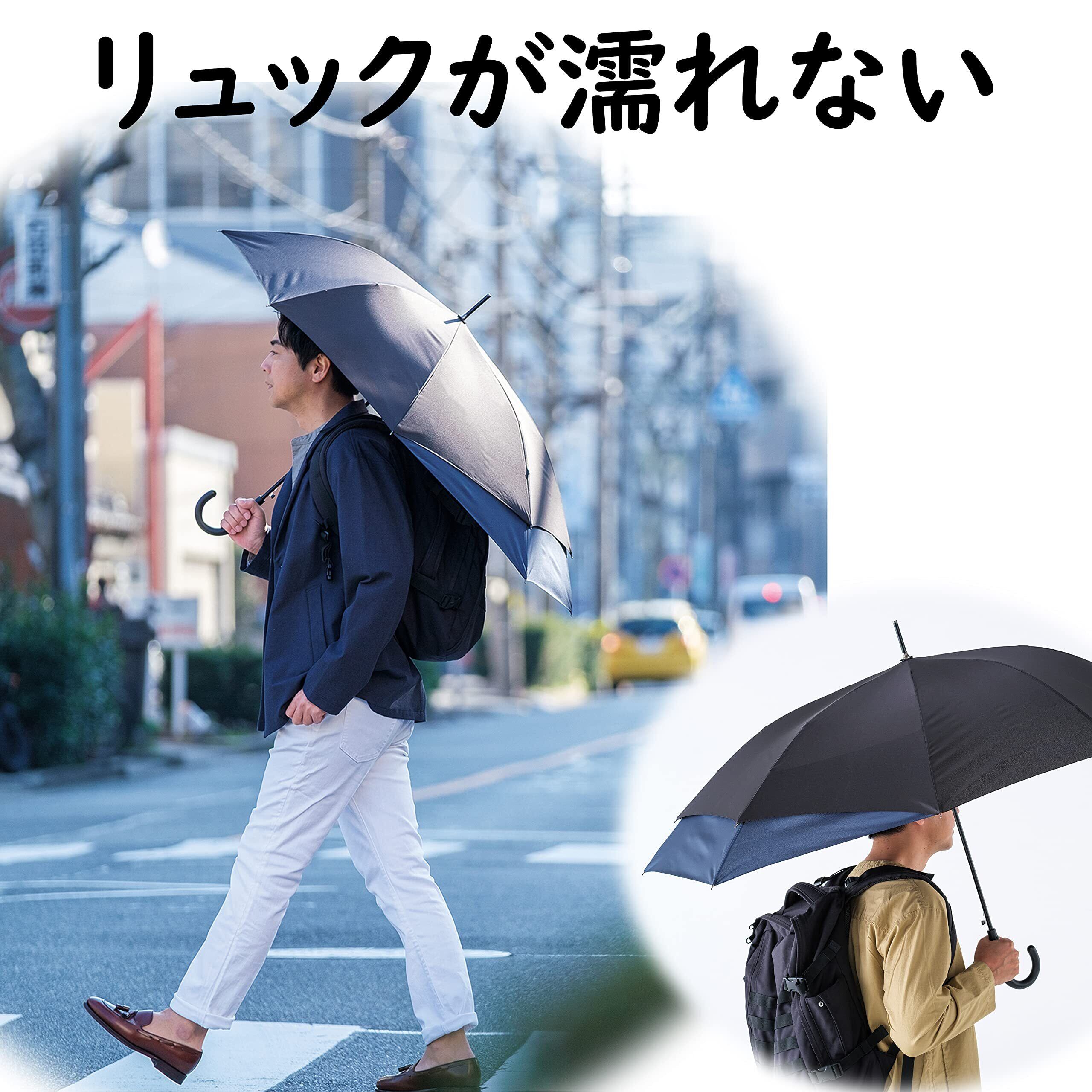 「バックパックはもちろん肩掛けタイプの荷物にも活躍」親骨の一部が長い構造のジャンプ傘です。バックパックはもちろん、延長部分を横にして肩掛けバッグの濡れ対策など、雨の吹き込みに対応。ビジネスシーンにも合うシンプルデザインに仕上げました。