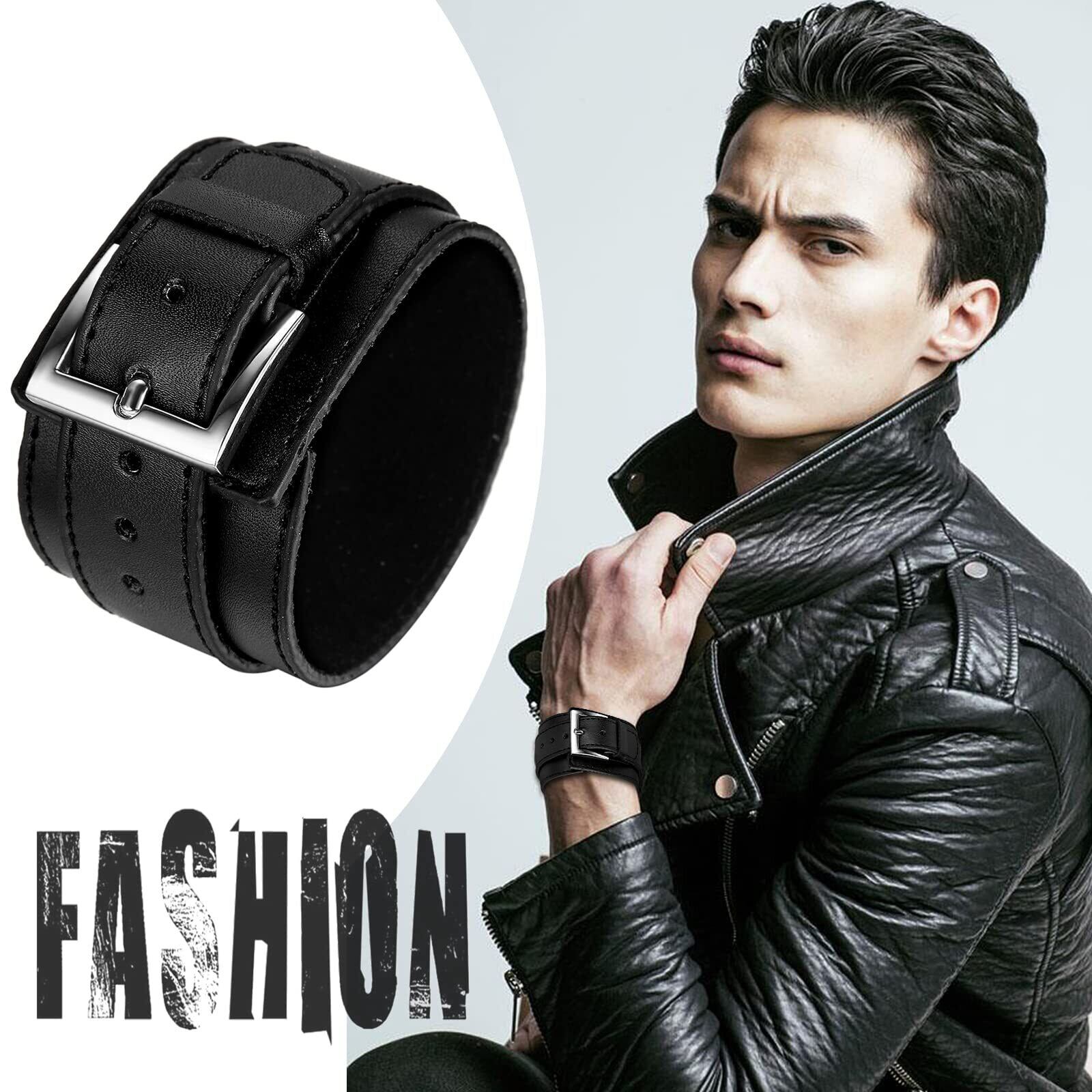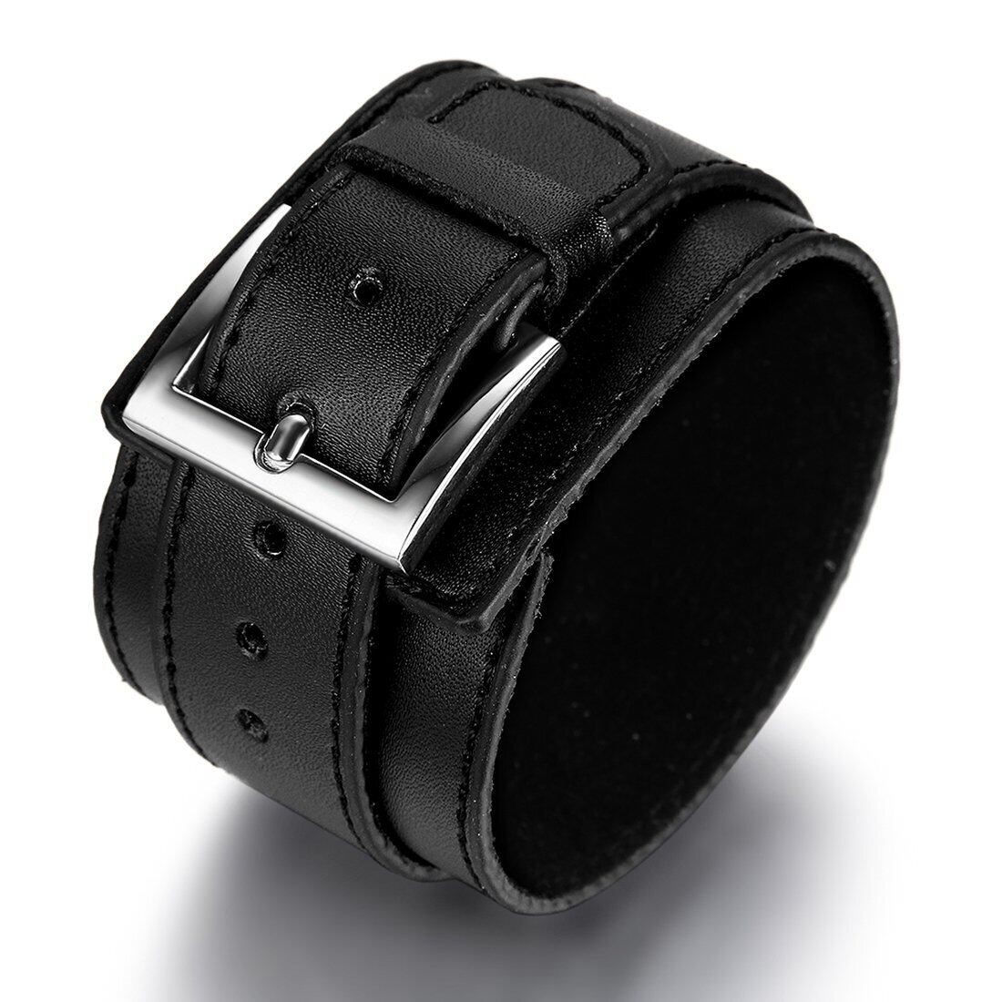 JewelryWe メンズ ブレスレット, ワイド 幅広 ゴシック パンク系 ロック バングル, レザー 本革, 合金, カラー:ブラック;[ギフトバッグを提供] ジュエリー ファッション アクセサリー