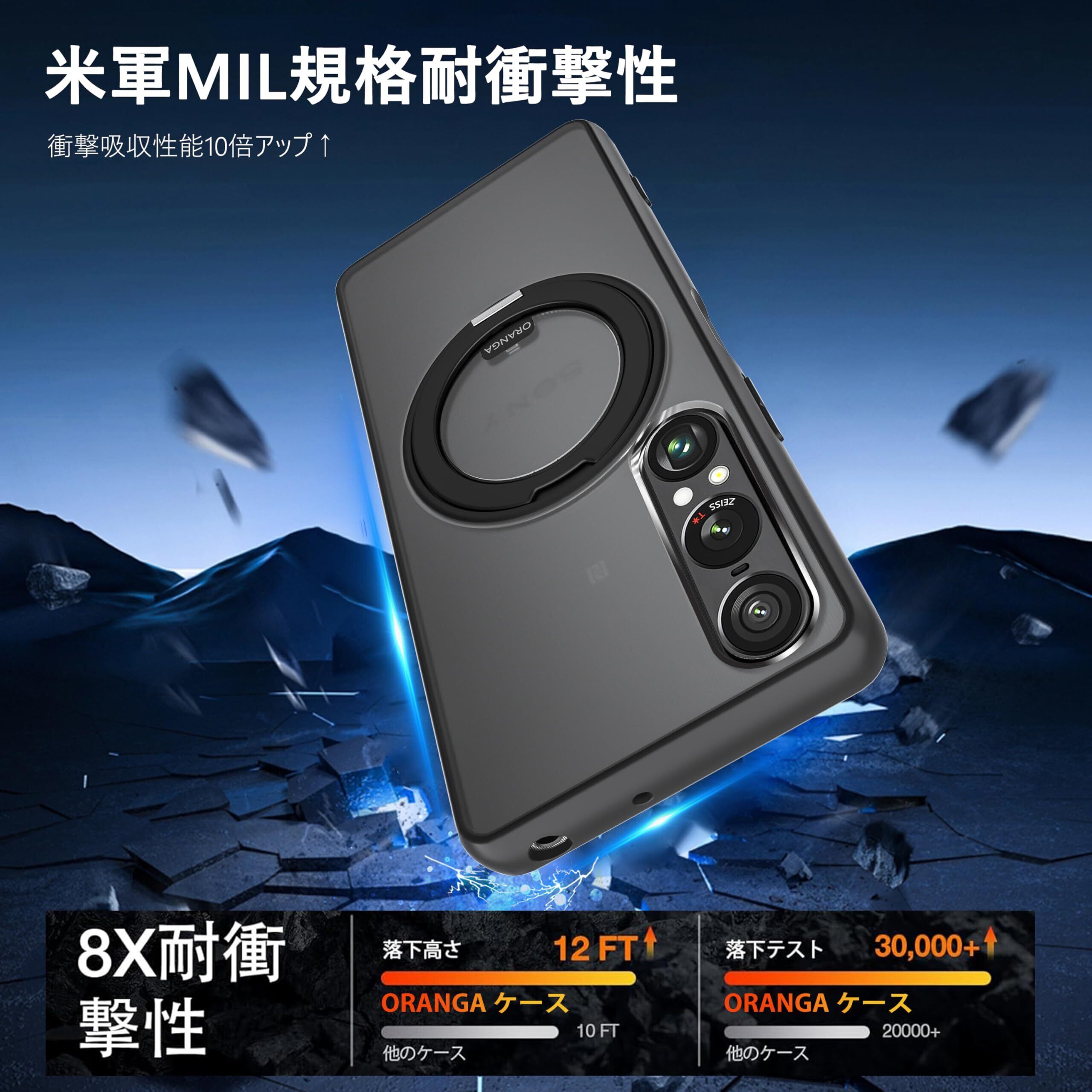 【新着商品】【改善型】 ORANGA SONY Xperia 1 VII ケース 【360度回転できるスタンド】 多機能一体 縦横両対応 マグネット搭載 MagSafe対応 ストラップホール付き 薄型 半透明 指紋防止 米軍MIL規格耐衝撃 リング マット感 黄変防止 エクスペリア1 VII カバー ブラック