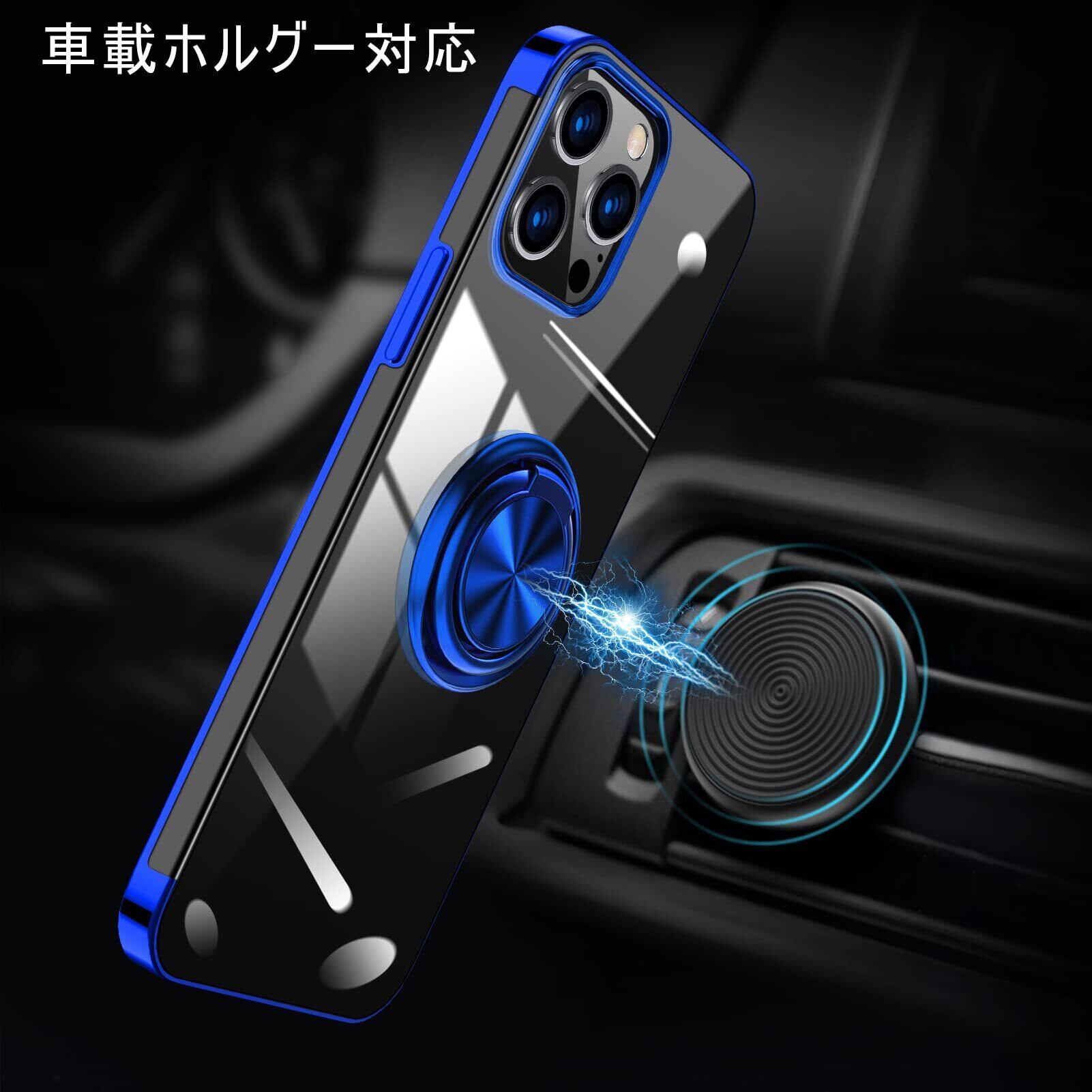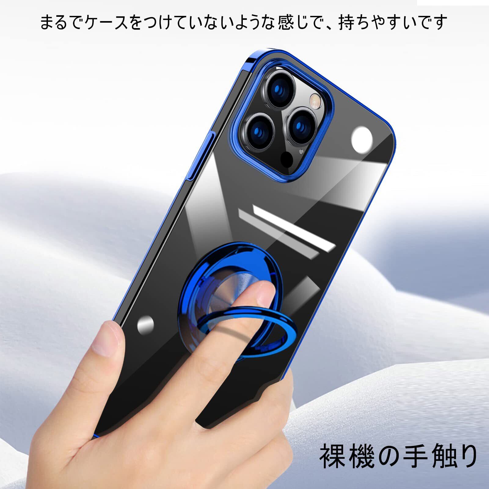 【WYEPXOL】iPhone 13 Pro Max ケース リング付き クリア tpu シリコン 軽量 薄型 メッキ加工 一体型 ソフト アイフォン 13 pro max カバー 耐衝撃 透明 黄ばみなし 耐久 車載ホルダー対応 ストラップホール付き スタンド機能 全面保護 人気 携帯カバー 青 ZW16-89