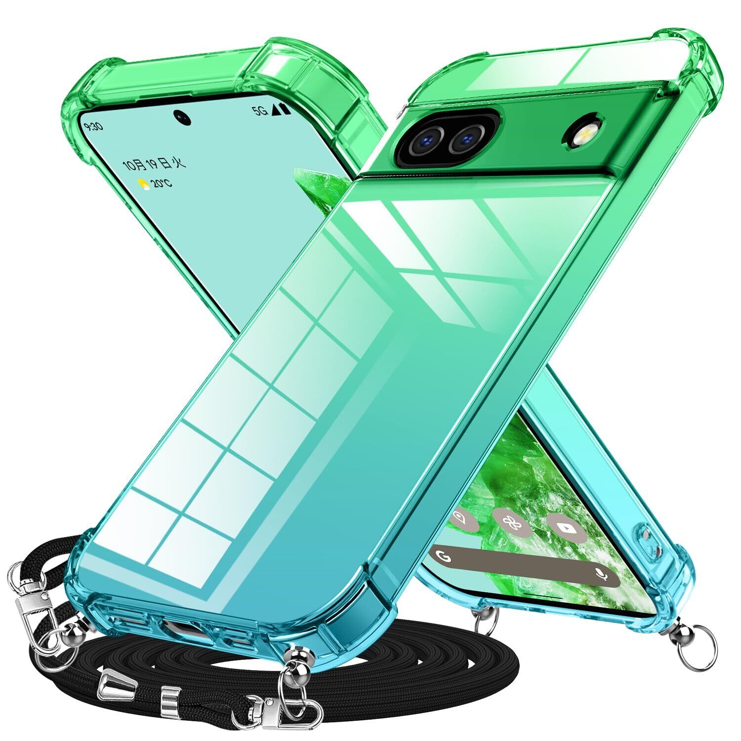Google Pixel 7a 用 ケース クリア ショルダー ストラップ グラデーションカバー 紐付き 肩掛け 斜めかけ pixel7a用 縄掛けケース 耐衝撃 TPU エアクッション 取り外し可能 調節可能な 透明 薄型 軽量 ネックストラップ 落下/紛失防止 ワイヤレス充電対応 可愛い ピクセル7A 用 ケース グリーン AYS-8-52