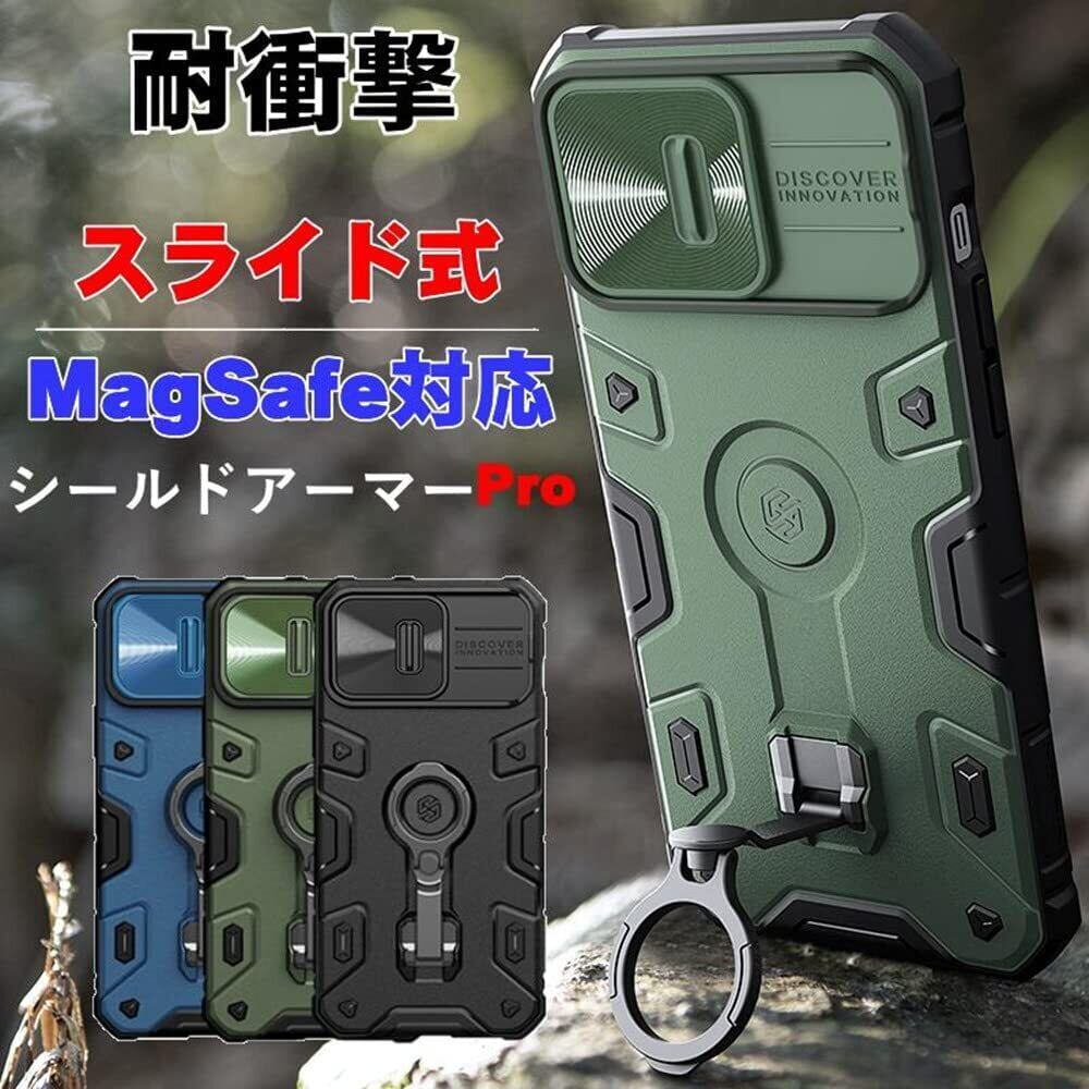 iPhone 14 Plus ケースリング付き [MagSafe対応] カメラカバー付き 耐衝撃 アイホン14 プラス 6.7 インチ スマホケース スライド式カメラプロテクター付き 全面保護 マグネット搭載 米軍MIL規格取得 360回転 緃置きスタンド機能 ワイヤレス充電対応 あいふぉん14 プラス カバー 背面保護カバー 男性, 緑-MagSafe対応)