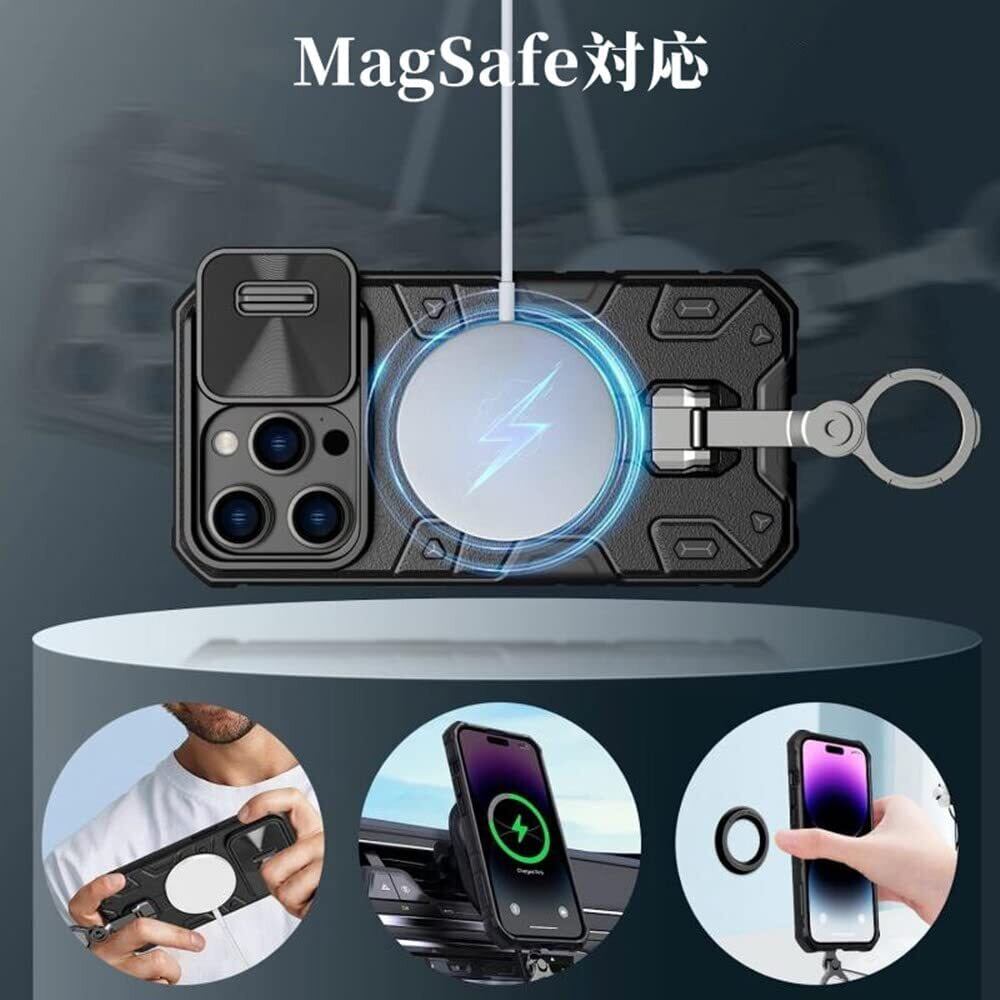リング付き iPhone 14Plus ケース MagSafe対応 マグネット搭載 スライド式カメラプロテクター付き アイホン14 プラス 6.7 インチスマホケースリング回転 横置き 緃置きスタンド機能 カメラカバー 無線充電対応 衝撃吸収 男性 iPhone 14 plus 背面保護カバー