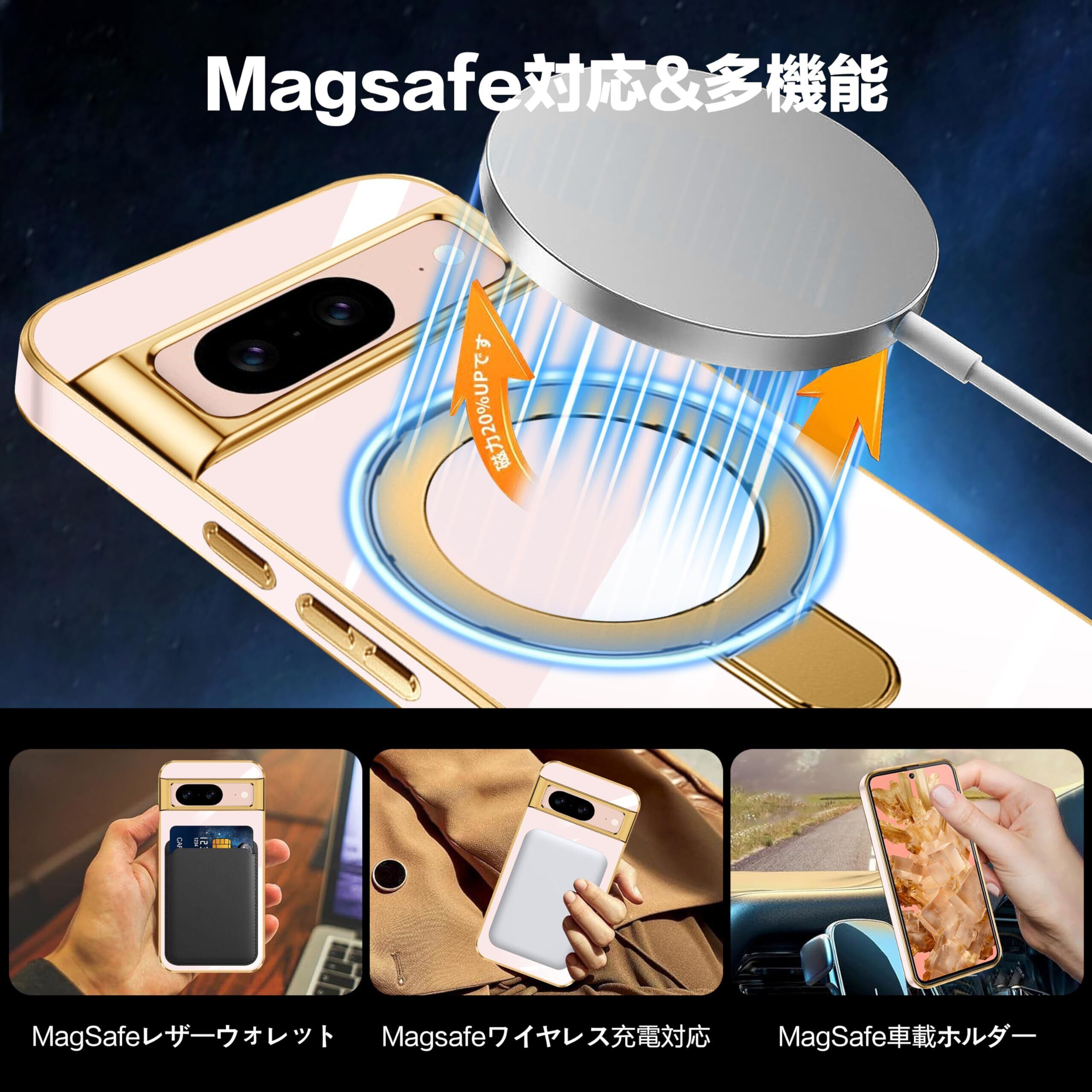 【新着商品】Google Pixel 8 用 ケース Magsafe対応 マグネット搭載 車載ホルダー リング付き スタンド機能 縦横両対応 TPU シリコン ソフト ストラップホール付き カバー レンズ保護 軟性 耐衝撃 全面保護(ピンク)