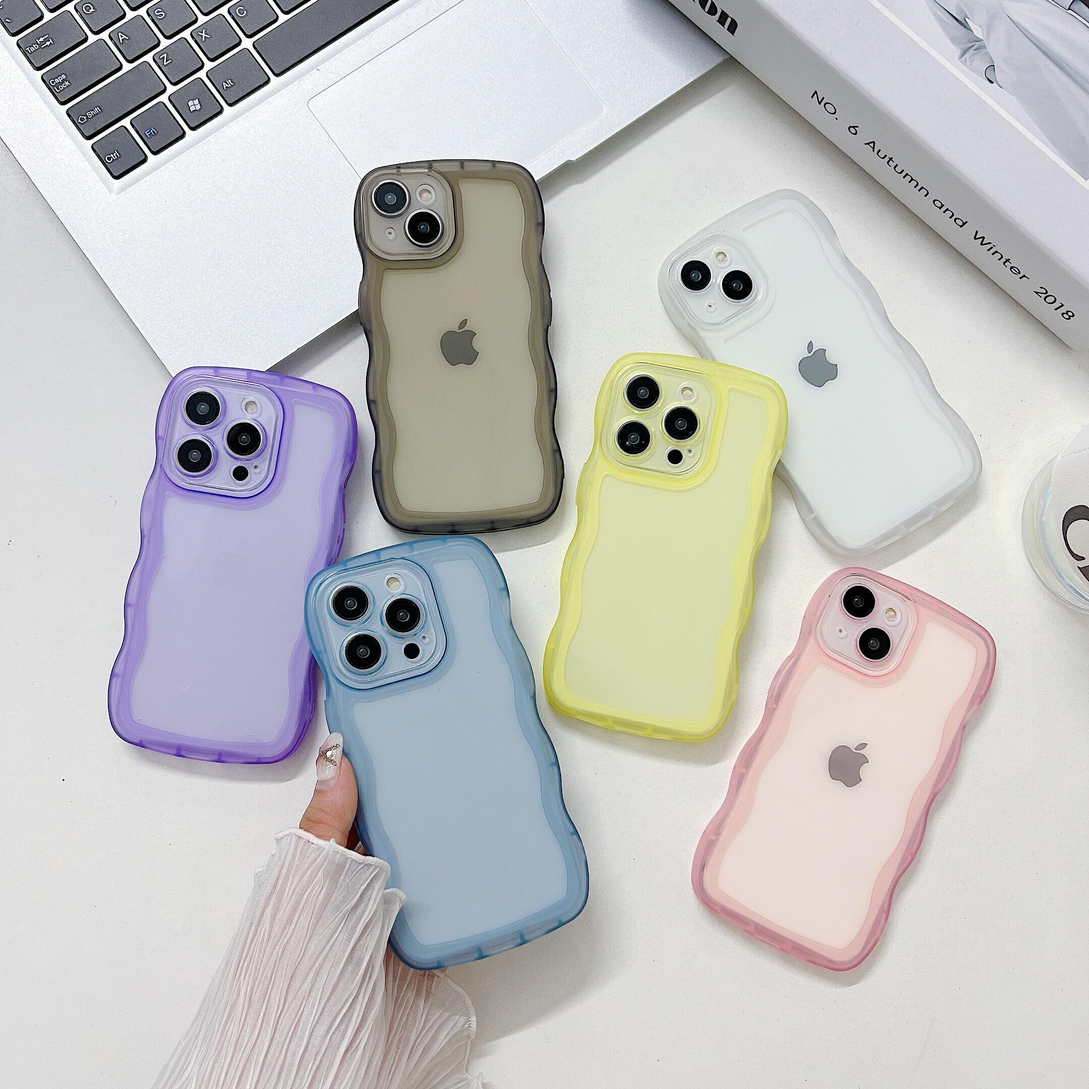 【個性派デザインで周りと差をつける】透明感のあるカラーと波型フレームの組み合わせで、他にはないユニークなデザイン。持つだけで手元が映える、トレンド感満載のスマホケース。