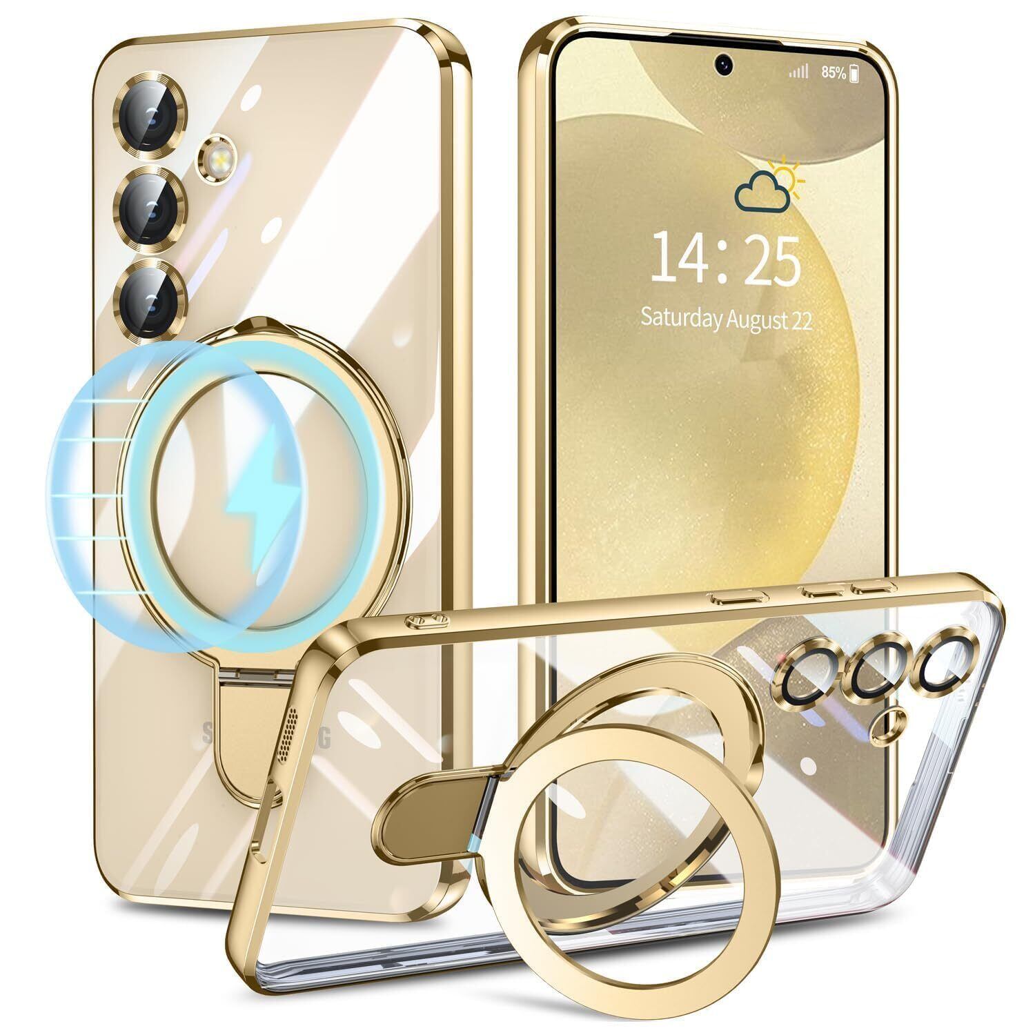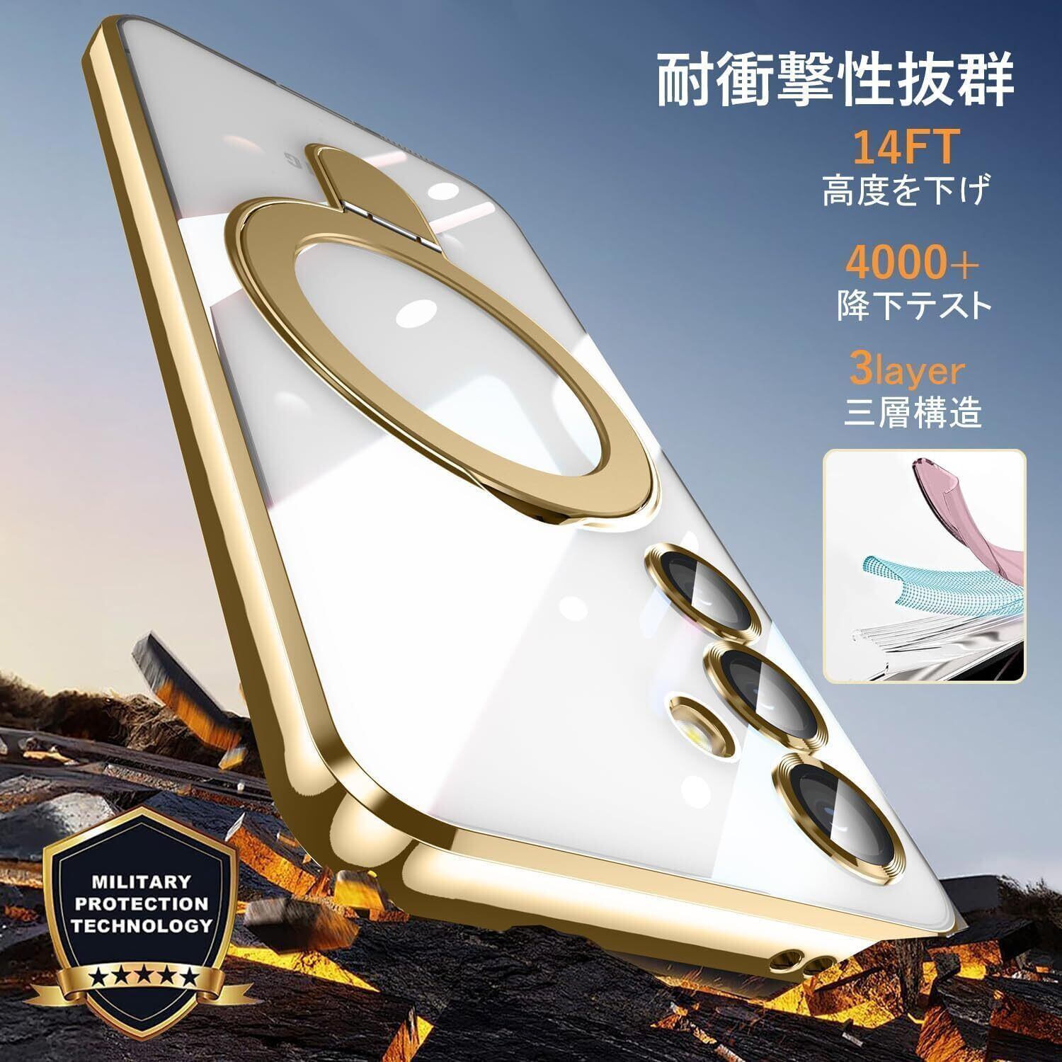 Galaxy S24 ケース【MagSafe対応 多機能隠しスタンド 縦横両対応 リング付き】Samsung ギャラクシー S24 / SC-51E / SCG25 用 携帯ケース 透明 一体型カメラレンズ保護 OURJOY スマホケース 電気メッキバンパー クリア 耐衝撃 ストラップホール付き ワイアレス充電対応・ゴールド