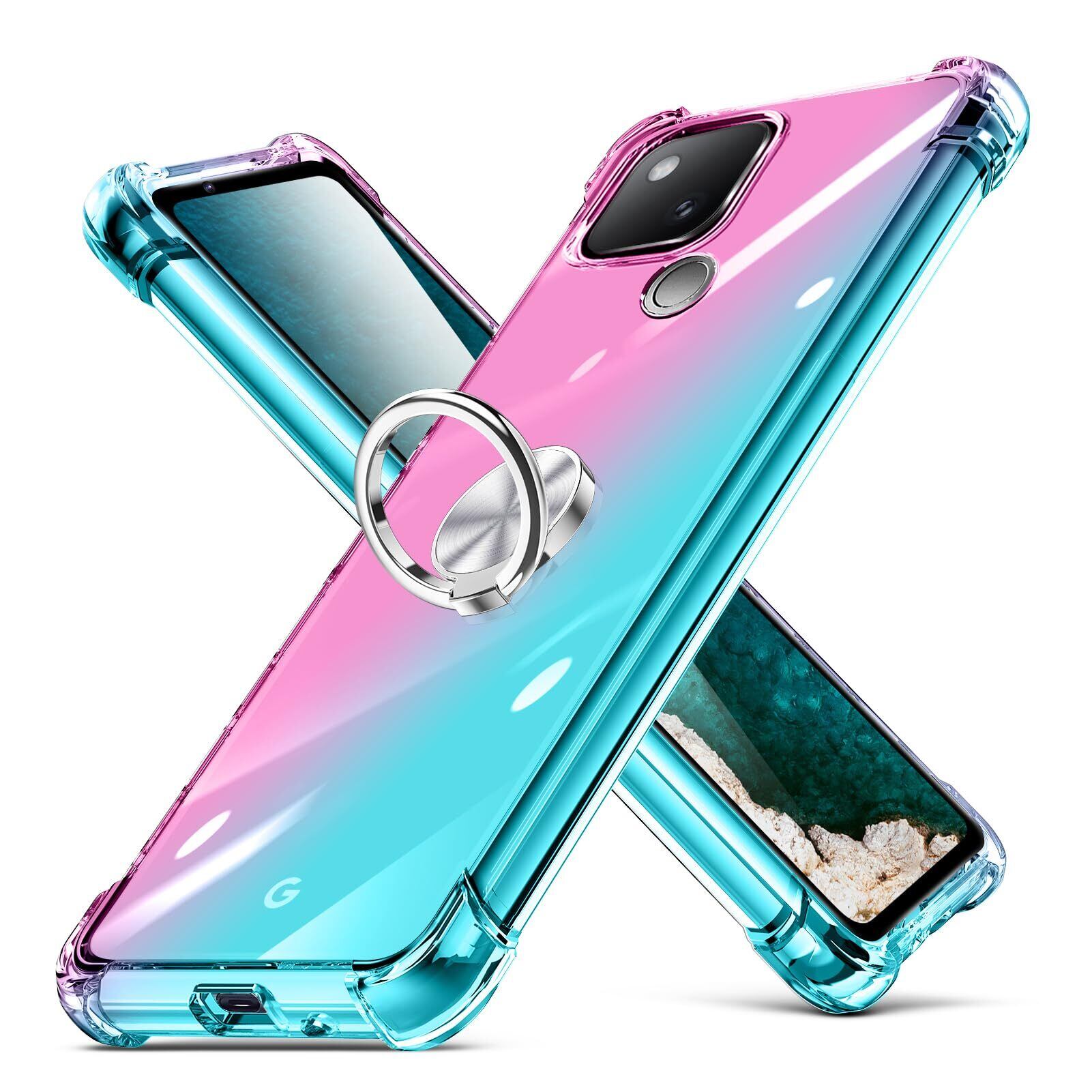 Google Pixel 4a ケース (5Gモデル非対応) 耐衝撃 リング クリア 透明 Pixel 4a カバー 耐衝撃 TPU クリア 透明 スリム 薄型 グラデーション スタンド機能 車載ホルダー TPU 黄変防止 指紋防止 防塵 滑り防止 人気 携帯カバー ピンク+緑D634-Pixel 4a-04