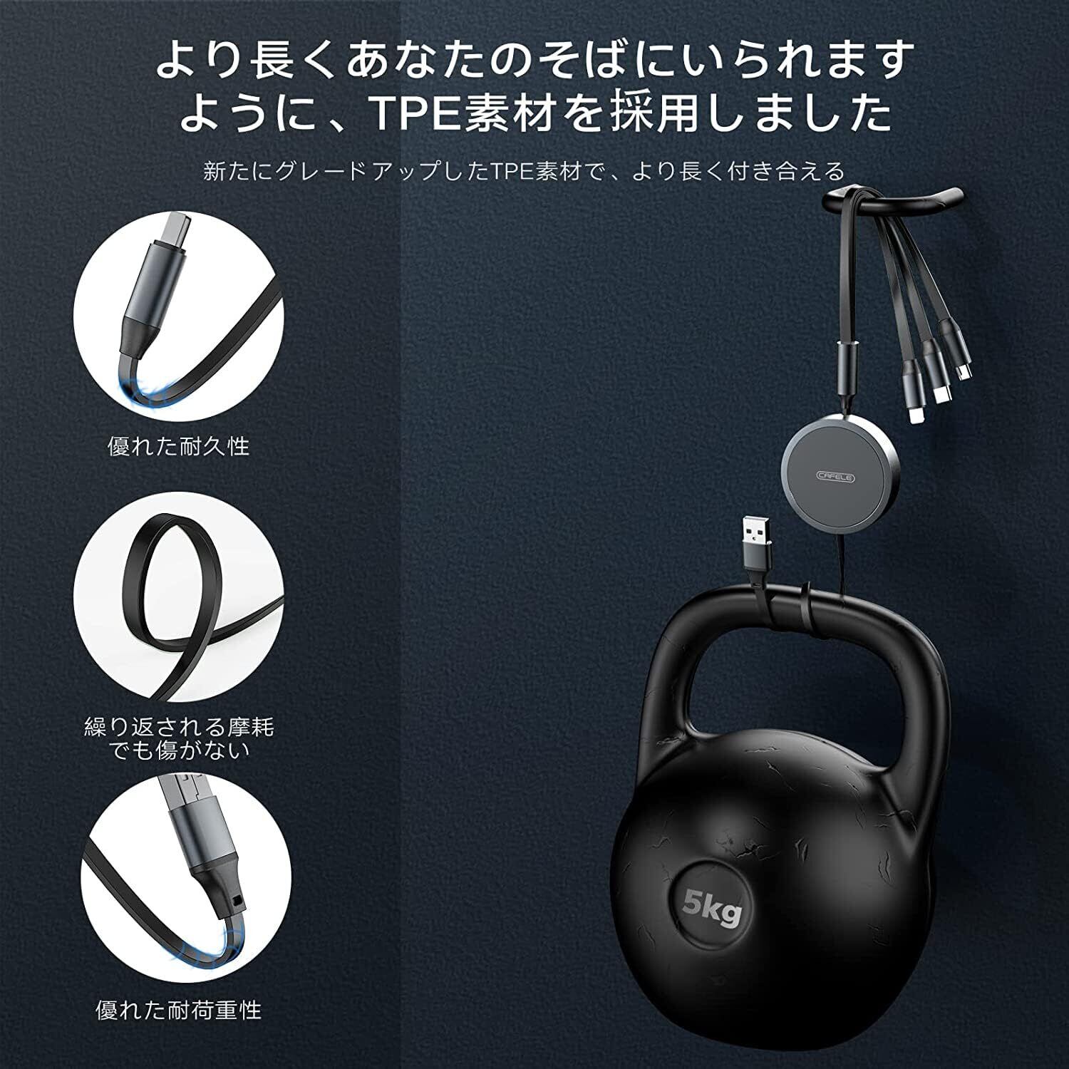 【在庫処分】【新登場 15w 巻き取り式ケーブル】CAFELE 3in1 充電ケーブル 巻き取り マイクロusb 5V3A急速充電 最大15W高速データ転 (10Sのみ)充電コード 送絡み防止 全機種に対応 usbケーブル/Micro/Type-c 120cm