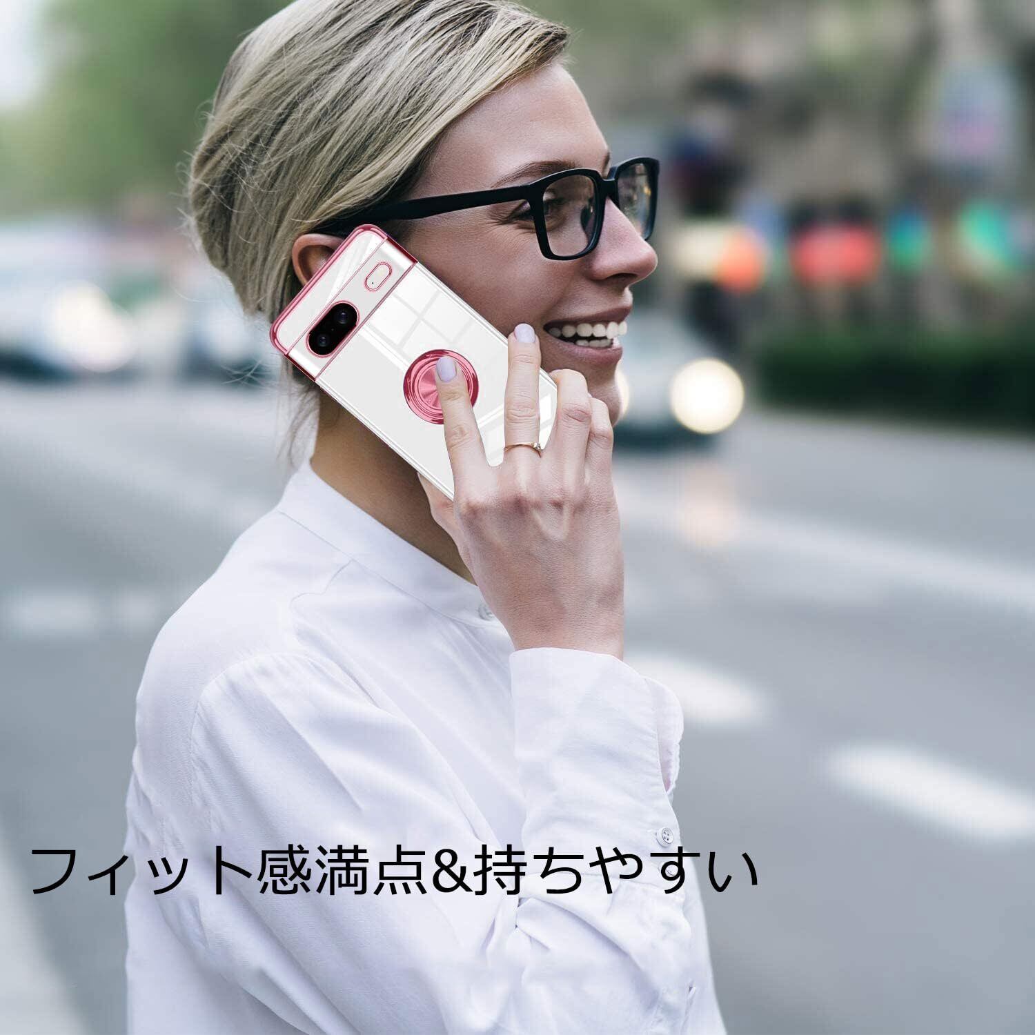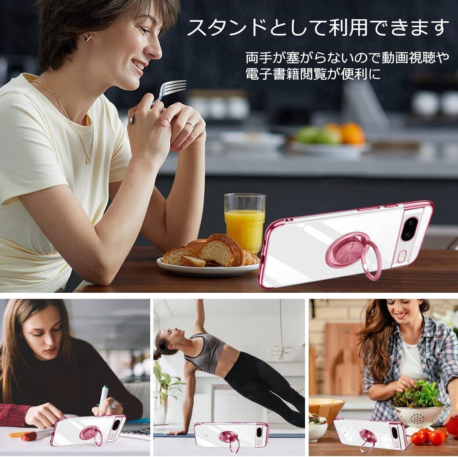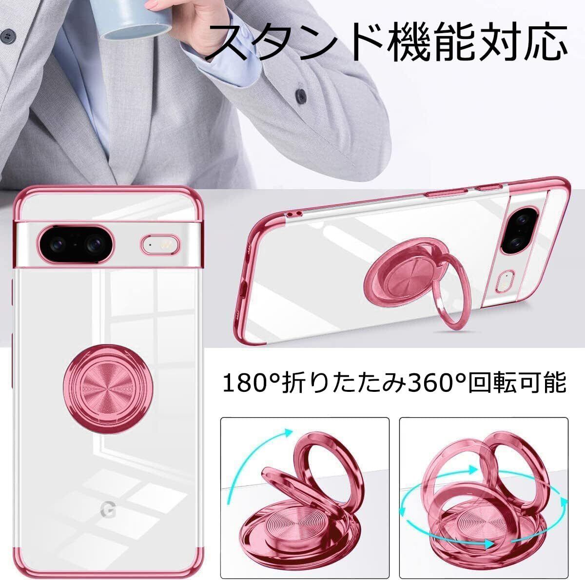 Google Pixel 8 ケース リング付き 隠しスタンド 耐衝撃 レンズ保護 車載ホルダー スタンド付き シリコンケース TPU クリア 透明 グーグル ピクセル 8 対応 保護カバー 全面保護 擦り傷防止 落下防止(ローズゴールド)