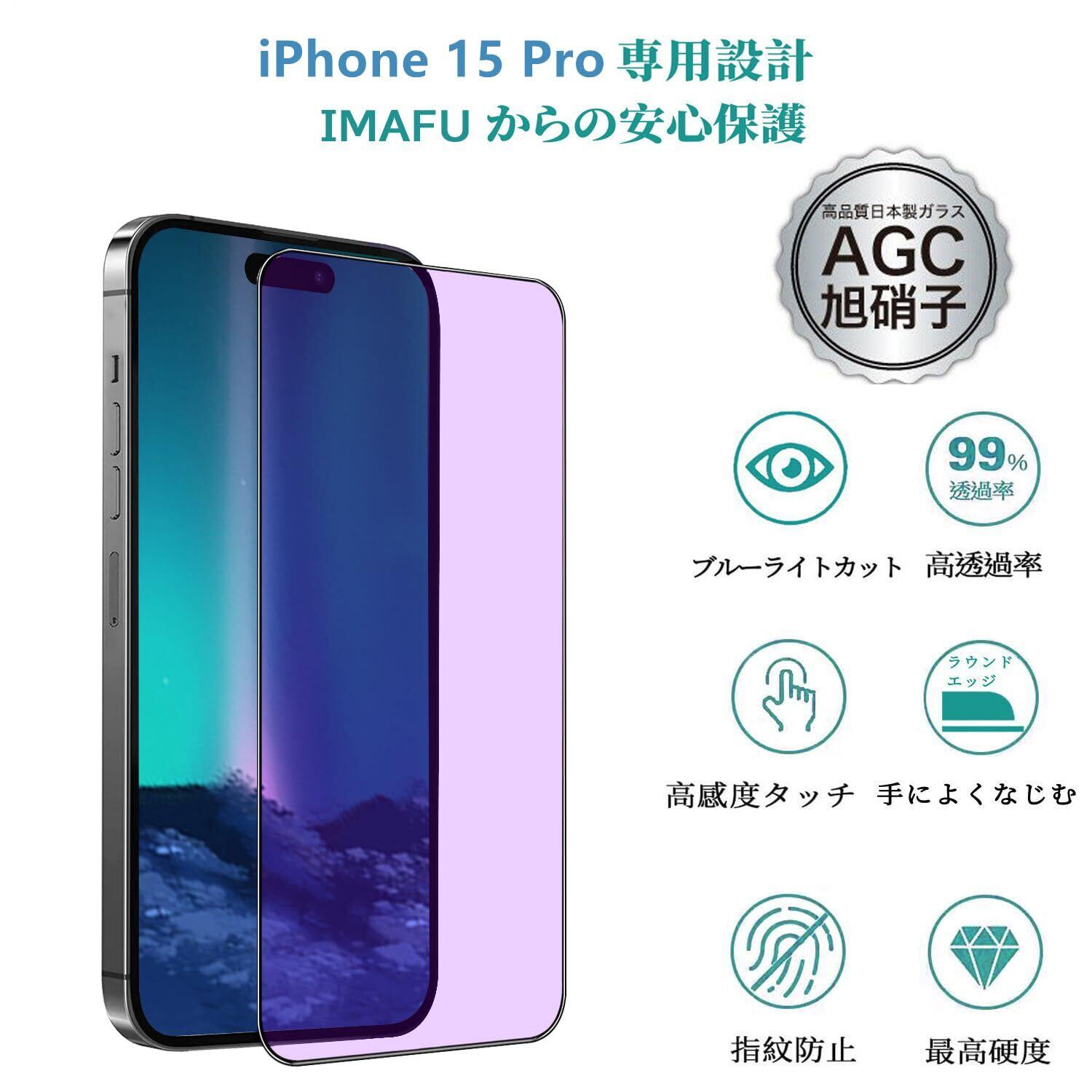 【ブルーライトカット 】 iPhone15Pro 用 ガラスフィルム 液晶保護 フィルム ブルーライト 強化ガラス アイフォン15Pro 用 (6.1インチ) 全面保護 【ガイド枠付き/硬度9H/指紋防止/気泡ゼロ/飛散防止/貼り付け簡単/2枚】
