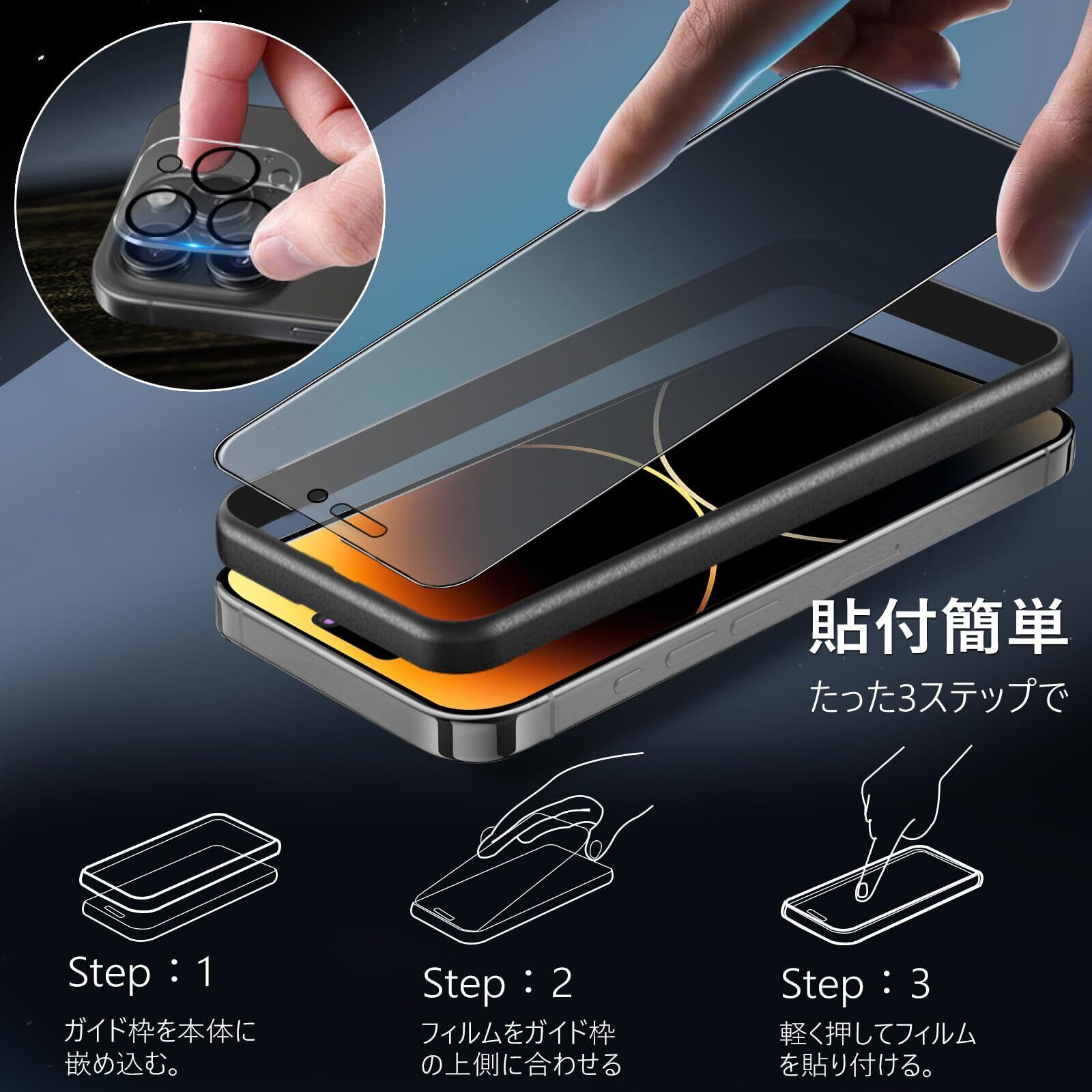 【2in1・多機能】 新技術を取り入れた2in1保護フィルムは、アンチグレア&覗き見防止機能を兼ね備えています。画面操作時の手触りをさらに改良し、より滑らかでサラサラな使い心地を実現しました。 【対応機種】 iPhone 14 Pro 用(6.1インチ対応)。【パッケージ内容】 iPhone14 Pro ガラスフィルム * 1枚セット + iPhone14Pro カメラフィルム * 1枚セット + ガイド枠 * 1枚。