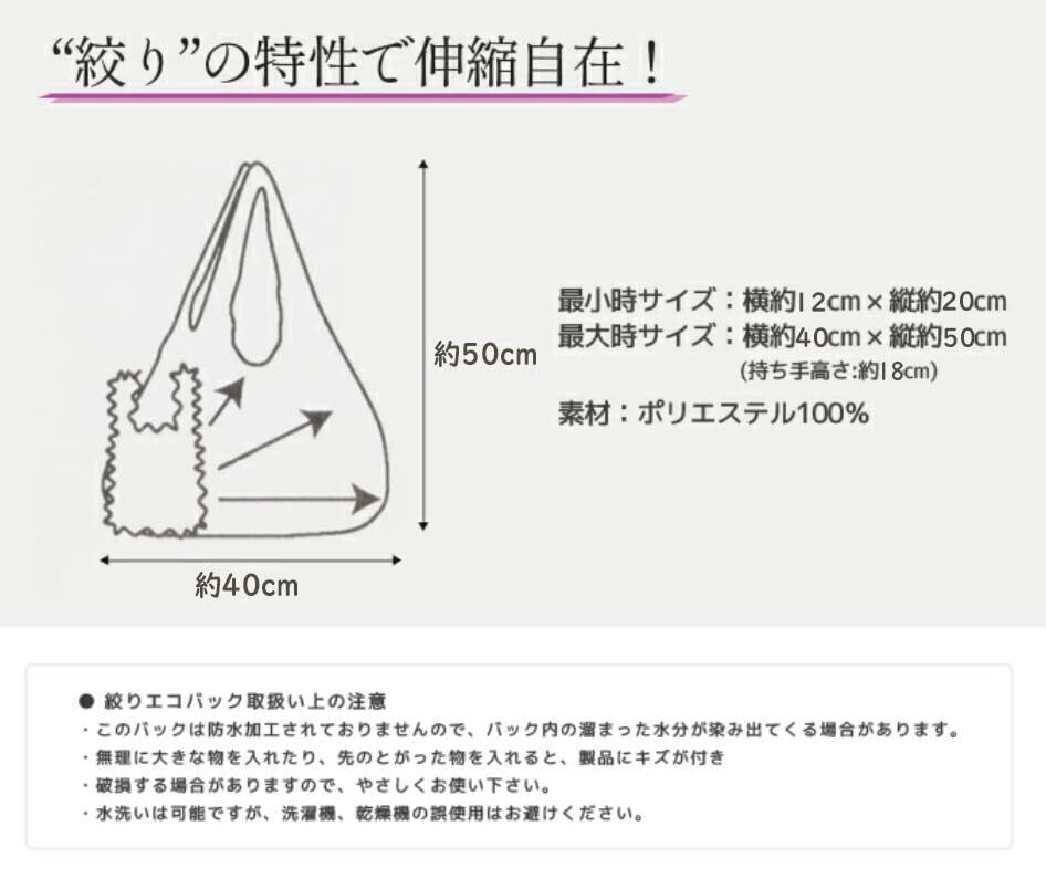 【特価セール】[hananogaku] エコバッグ 絞り コンパクト 軽量 たたみ不要 ドロールバッグ しぼり くしゅくしゅ