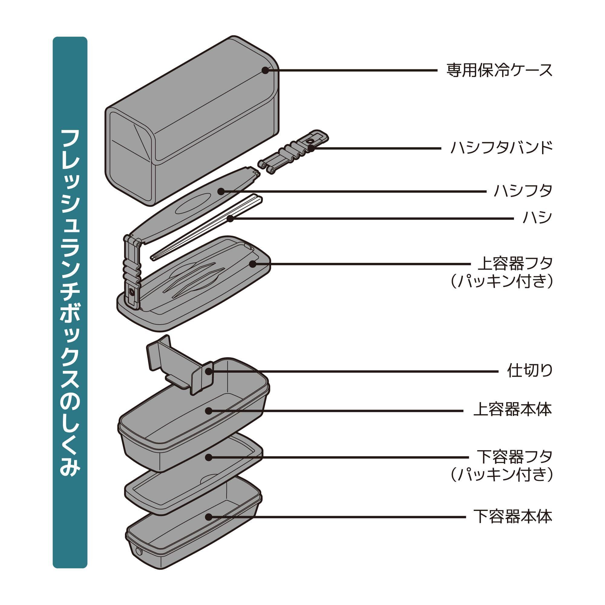素材・材質:上容器本体・下容器本体・仕切り・上容器フタ・下容器フタ:ポリプロピレン / ハシフタ:ABS樹脂 / ハシフタバンド・上容器パッキン・下容器パッキン:シリコーンゴム / ハシ:メタクリル樹脂 /【専用保冷ケース】外生地・内生地:ポリエステル / クッション(断熱材):発泡ポリエチレン